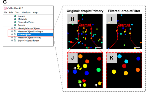 为了计数荧光液滴的数量并排除只有荧光斑点的液滴,作者引入了开源软件(CellProfiler)进行图像分析(下图G)。使用设置的大小范围和形状参数(软件中的FilterObjects),几乎消除了来自细胞碎片的所有干扰(下图H−K)。可准确获取有靶点的液滴数(阳性液滴)。同时,使用相同的软件获取液滴总数。在白细胞丰富的背景下对靶点的高效扩增和阳性液滴的精确计数是数字CTC定量的基础。结合泊松分布数据(阳性液滴数和总液滴数)可直接输出CTC数量。