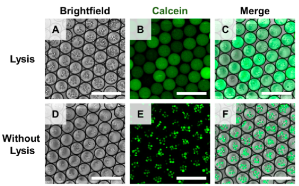 在微流控中裂解细胞的一种常见策略是使用蛋白酶或碱性使细胞蛋白非特异性变性。然而,蛋白酶或碱性也会使聚合酶变性,这是聚合酶链反应的关键成分。因此,使用这些化学物质的方法需要两步液滴反应:(a)用细胞裂解组分包裹细胞以裂解细胞,然后加热使蛋白酶失活或中和碱性物质。(b)将含有聚合酶的液滴与含有裂解产物的液滴合并,从而启动PCR。虽然这些方法非常有效,但需要仔细处理液滴,并且难以使两个液滴同步。复杂的操作降低了分析速度,并导至了显著的细胞损失。