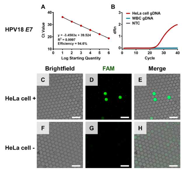 适用于血液中CTC数字定量的一种策略要求能够在液滴中存在血细胞的情况下特异性扩增肿瘤特异性基因。因此,在评估CTC定量性能之前,作者验证了在大量血细胞背景下扩增肿瘤特异性基因时的抗干扰能力。将HeLa细胞加入去除红细胞的全血细胞中,作为样本进行测试。应用液滴包封样品、裂解液和PCR试剂,在白细胞丰富的背景下扩增HPV 18 E7基因,检测HeLa细胞。结果表明,含有两种细胞的液滴在扩增后呈现绿色荧光,这意味着整个球形液滴发出绿色荧光(下图A−C)。而仅含有白细胞的液滴则出现不规则的荧光斑点,这可能与白细胞碎片富集Taqman探针有关。根据HeLa细胞与液滴数量的比例,大多数液滴仅含有不规则的荧光碎片。在没有HeLa细胞的样本中,只能在液滴中观察到不规则的荧光斑点(下图D−F)
