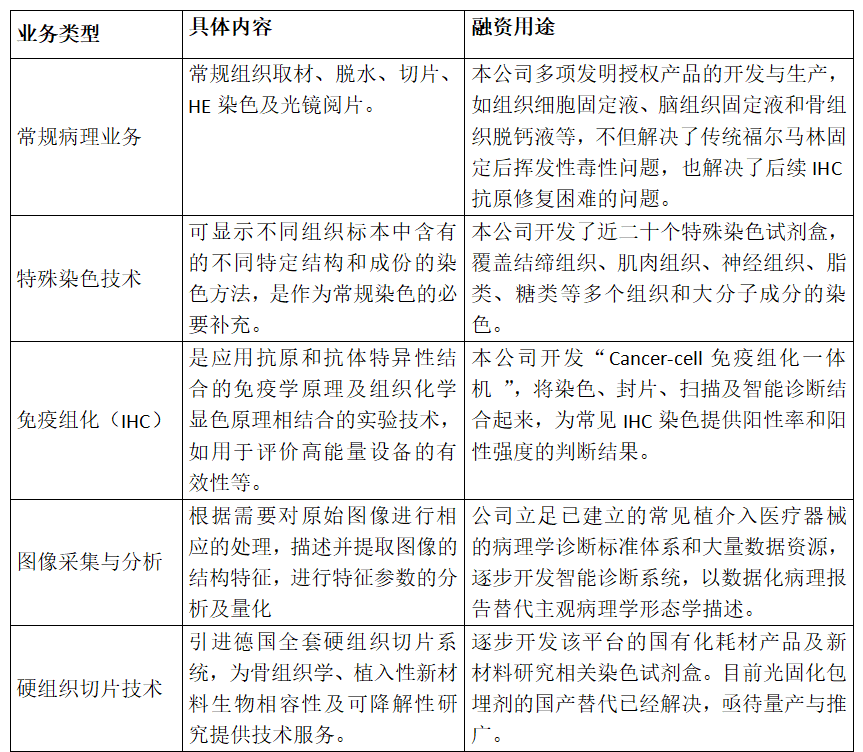 但目前,相对于欧美日等发达国家,我国医疗器械临床前CRO机构在基础设施、仪器设备、人员配置及体系化标准化等方面均存在一定差距,具有国际认可的检测机构更是凤毛麟角。由于不同于药物临床前评价,医疗器械的安全性和有效性评价很大程度上依赖于组织病理技术与诊断,提高病理技术和诊断水平才有望保证评价报告的专业性和权威性。如今,虽然很多CRO机构开展了常规病理业务(HE染色和显微镜诊断),但普遍需求的特殊染色、免疫组织化学(IHC)、图像分析及硬组织切片等诸多技术(如下表所示)的开展却受限于相关耗材的供应。堪赛尔本轮融资旨在解决这一问题,以满足标准化运营企业暨GLP体系化CRO及医疗单位的质控要求。