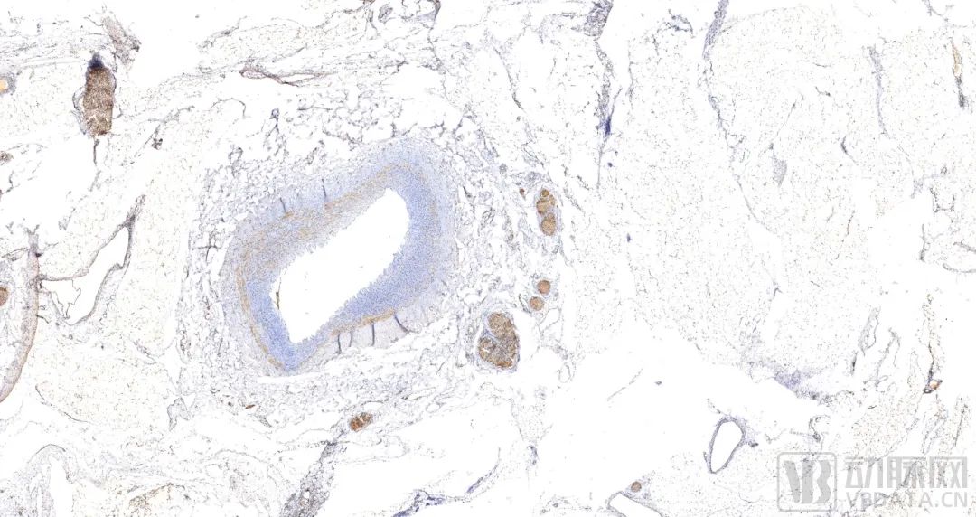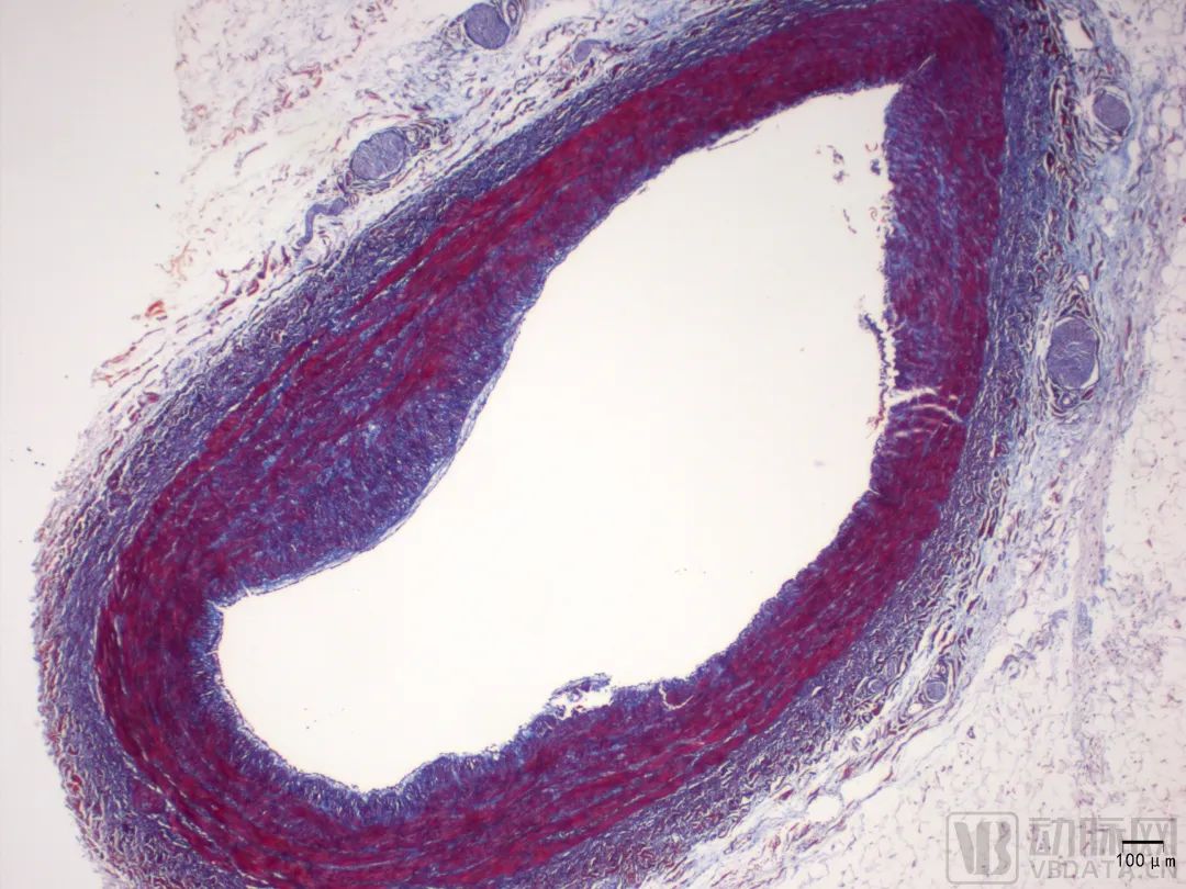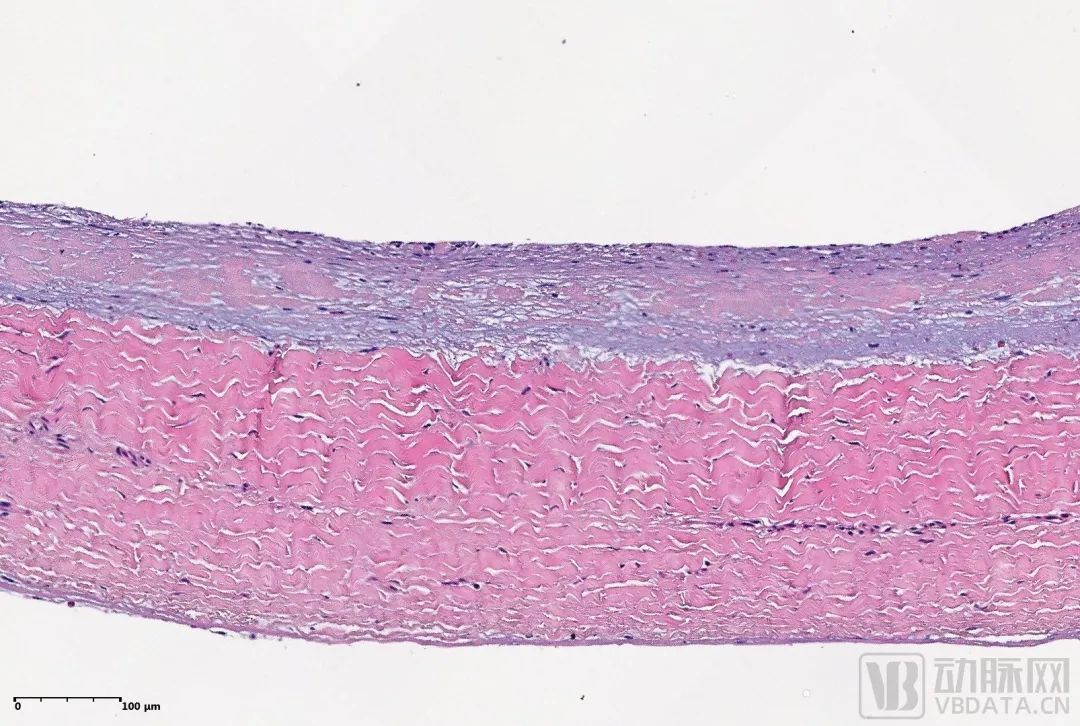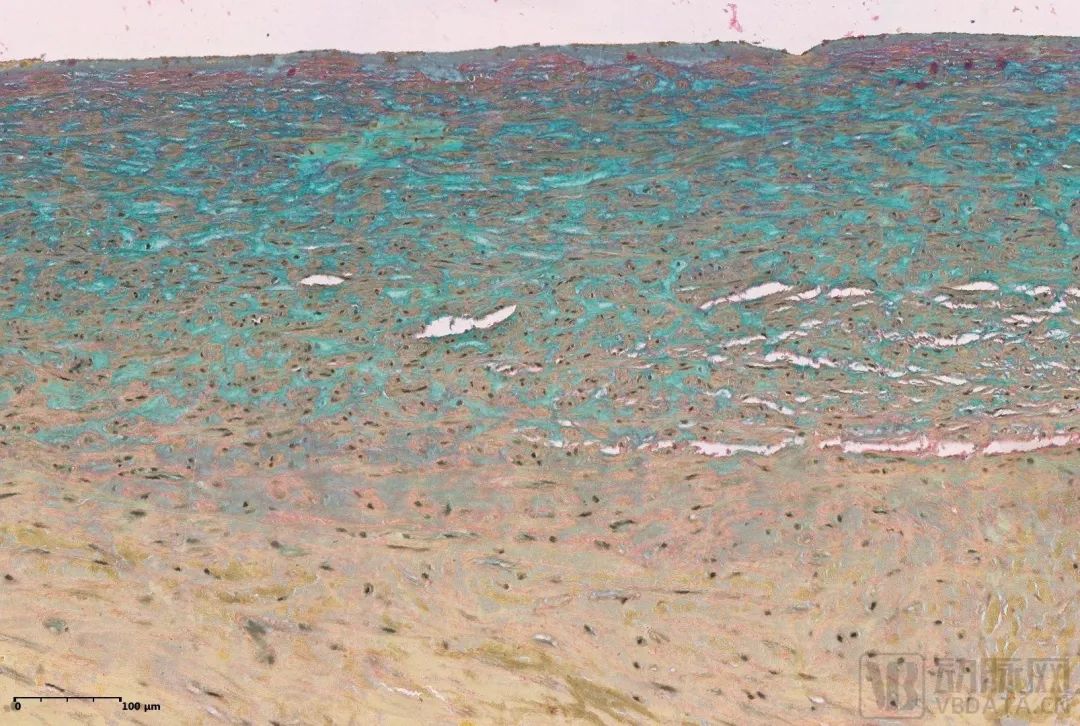 自主研发的特殊染色试剂显示心脏瓣膜(Movat染色 上图)和血管( Masson染色 下图)