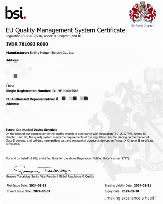 热景生物小型化学发光平台适配试剂获CE IVDR证书 近日,热景生物国内单人份化学发光类产品率先获得CE IVDR证书,由欧洲最有声望的认证机构之一英国标准协会(BSI)颁发。首批获得CE IVDR认证的产品涵盖了心肌、炎症、激素、肿瘤等多个重要临床检测领域中的14个关键诊断指标。这些产品的成功认证得益于热景生物在研发、生产、质量控制等方面,与国际高水平标准接轨的不懈追求,也印证了热景生物创新诊断产品在全球市场领先的品牌认可度。 圣湘结核检测产品获欧盟CE IVDR认证 近日,圣湘生物自主研发的结核分枝杆菌核酸检测试剂盒(PCR-荧光探针法)获欧盟CE IVDR认证,该款呼吸道产品是公司获得的首个Class C级别的准入证书,为公司结核产品的全球布局提供了有力支持,也为全球在2030年前消灭结核的目标贡献了“圣湘力量”。 硕世生物9项产品获欧盟IVDR认证 硕世生物9个产品近期获得欧盟 Regulation (EU) 2017/746的CE认证,产品获得欧盟 IVDR的CE 认证后,可在欧盟国家和认可欧盟 CE 认证的国家进行销售,公司海外销售产品品类得到进一步扩充,相关产品的海外应用场景拓宽,这对于公司海外销售及国际业务拓展具有积极作用。 优利特产品荣膺美国FDA、欧盟IVDR双重认证 继优利特UC-1800全自动尿液分析仪成功通过美国FDA认证后,优利特尿液分析产品和POCT产品获得FDA准入,全线体外诊断产品也成功通过IVDR认证,标志着其技术创新与产品质量已达到国际水准。 锦瑞生物多项产品通过欧盟IVDR认证 近日,锦瑞生物多项产品通过了IVDR CE B/C类认证,公司收到了由欧盟公告机构TÜV南德意志集团颁发的IVDR CE证书,其中包括三分类血液分析仪系列产品以及多项特定蛋白检测试剂。 -END- CACLP综合整理 |