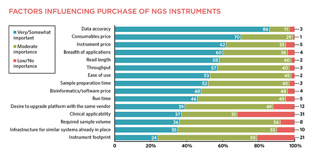 影响购买者选择的因素: 数据的准确性和操作成本,这两者是购买测序设备的最重要采购标准。但是如果两种仪器的数据精确度相同,那么操作成本、应用的广泛性,读长和通量就成为了第二重要的参考因素。