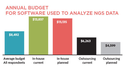 NGS软件分析预算: 每年NGS 数据注释软件的预算是外包费用的两倍多,目前NGS 软件整体平均预算约为8,500 美元,不过这一数据还表明,内部和外包所花费的费用存在巨大差异,前者的费用约为13,000- 14,000美元,后者的费用为4500-6300 美元)。 参考文献: Next-Gen Sequencing User Survey |