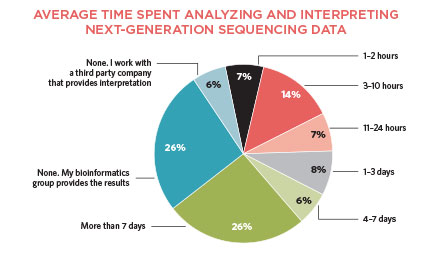 今年The Scientist杂志与另外一家国际市场情报与咨询公司Frost & Sullivan合作,展开了一项新一代测序技术使用情况的用户调查活动。 调查结果显示,目前大部分新一代测序技术研究工作主要集中在基础研究和疾病相关的研究方面。这一调查受访者中约有40%的研究人员参与了新一代测序研究,不过下半年的人数可能还会增加4%,还有一半受访者表示在未来的两年内,将计划进行着方面的研究。 目前新一代测序技术流程中最大的瓶颈是分析和注释数据所花费的时间太长,大约有 32%的受访者都将这些工作外包给生物信息学同事,或者第三方公司。 那么影响购买者购买仪器的因素有哪些呢? 调查显示,数据的准确性和操作成本,这两者是购买测序设备的最重要采购标准。但是如果两种仪器的数据精确度相同,那么操作成本、应用的广泛性,读长和通量就成为了第二重要的参考因素。 平均花费的时间: NGS 工作流程的最大瓶颈是分析和注释数据所花费的时间太长。有四分之一的研究人员表示NGS数据分析需要至少一周时间,还有32%的受访者将这一工作外包给其他生物信息学组同事或第三方公司。