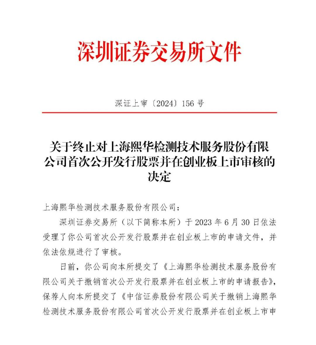 2024年6月19日,深交所官网显示,由于主动申请,上海熙华检测技术服务股份有限公司(简称:熙华检测)创业板IPO上市终止。
