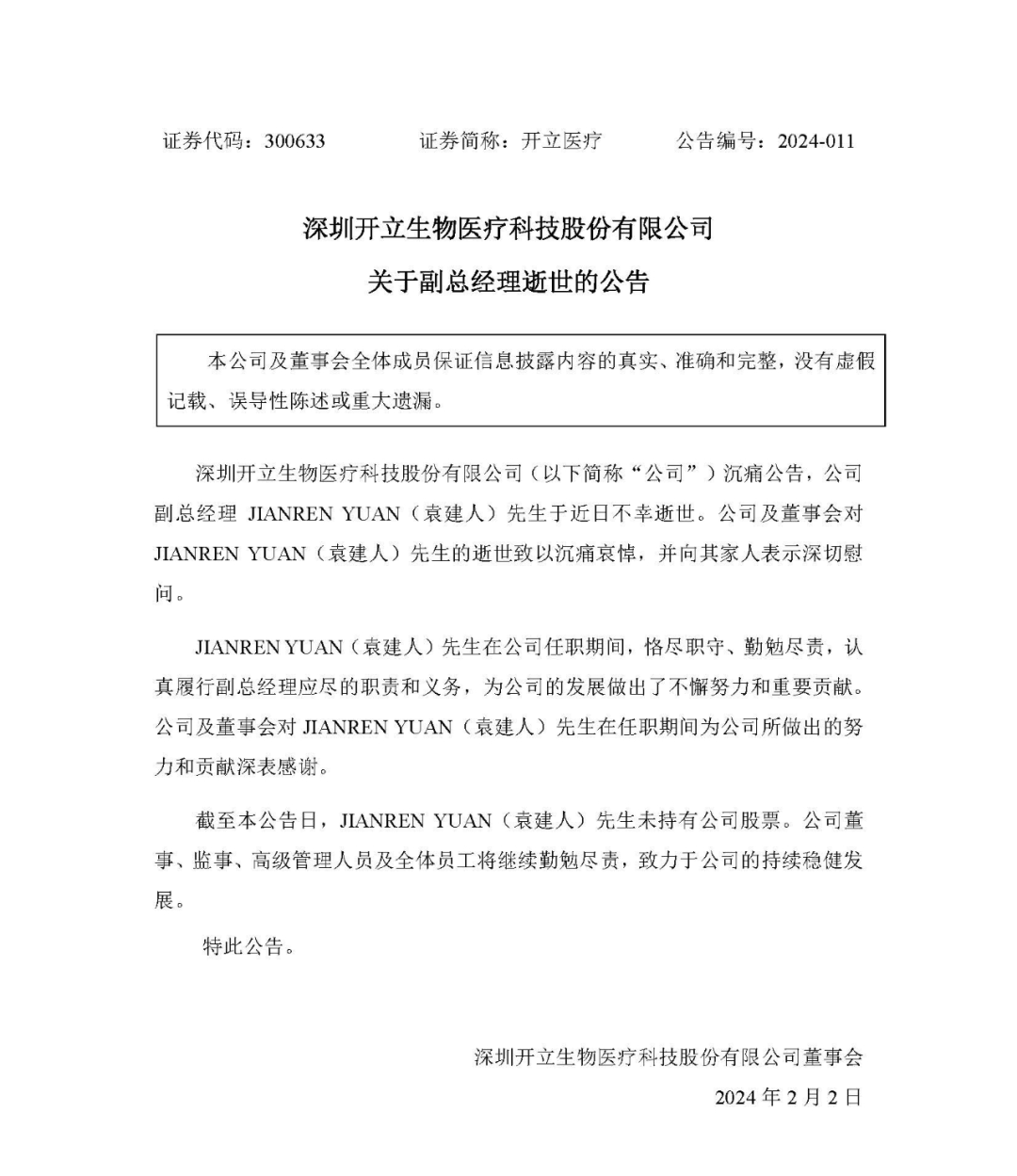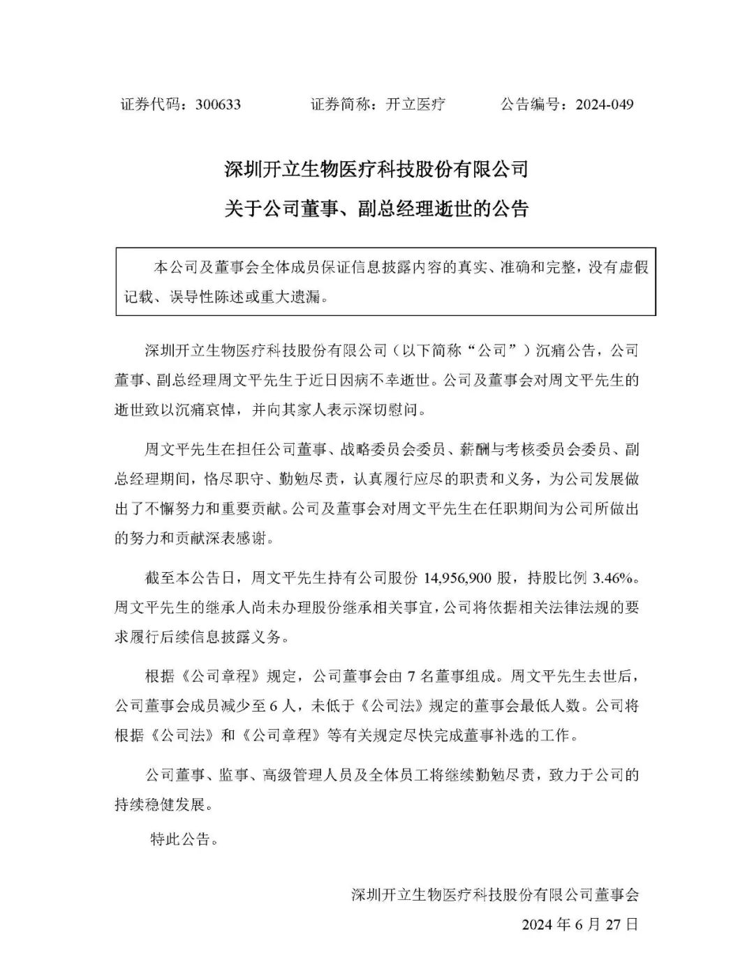 6月27日,开立医疗发布公告,公司董事、副总经理周文平于近日因病去世。 深圳开立生物医疗沉痛公告,公司董事、副总经理周文平先生于近日因病不幸逝世。公司及董事会对周文平先生的逝世致以沉痛哀悼,并向其家人表示深切慰问。 截至本公告日,周文平先生持有公司股份14,956,900 股,持股比例 3.46%。周文平先生的继承人尚未办理股份继承相关事宜,公司将依据相关法律法规的要求履行后续信息披露义务。 据2023年年报, 周文平,男,1970 年出生,中国国籍,无境外永久居留权,高级工程师。1992 年毕业于清华大学生物医学工程与仪器专业,学士学位。1992年7月至1993年2 月任职于汕头超声仪器研究所;1993年2月至1994年2月任职珠海超人公司超声产品研发部工程师;1994年2月至2002年5月,任职于汕头超声仪器研究所,任研发工程师;2002年5月至2002年12月任深圳迈瑞生物医疗电子股份有限公司超声研发部工程师;2002年12月至今,任职于开立医疗,历任研发部经理、副总经理等职务;2005年至2009年任公司监事。现任开立医疗董事、副总经理,兼任广东省超声医学工程学会常务理事。 开立医疗表示,周文平先生在担任公司董事、战略委员会委员、薪酬与考核委员会委员、副总经理期间,恪尽职守、勤勉尽责,认真履行应尽的职责和义务,为公司发展做出了不懈努力和重要贡献。公司及董事会对周文平先生在任职期间为公司所做出的努力和贡献深表感谢。 今年2月,开立医疗副总经理之一JIANREN YUAN(袁建人)也因病去世。 据开立医疗年报, JIANREN YUAN(袁建人),男,1947 年出生,美国国籍。1967年毕业于哈尔滨军事工程学院水声物理专业,获得学士学位。1985年至1987年于美国 Catholic University of America (美国天主教大学)攻读物理(声学)硕士;1987 年至 1992 年于美国 Catholic University of America (美国天主教大学)攻读物理(声学)博士。1968 年至1978 年任山东淄博无线电五厂总工程师;1981年至1985年任山东淄博无线电五厂研究所所长;1992年12月至2000 年12月任美国 Philips 医疗超声系统总工程师;2000 年12月至2010年8月任美国波士顿科学公司(BSC)研发部经理、院士 (Fellow);2001年1月至2010年7月任上海爱培克电子科技有限公司董事长;2010年8月至2013年12月任飞利浦医疗系统上海爱培克电子科技有限公司总经理。2014年加入开立医疗,现任开立医疗副总经理,兼任上海爱声生物医疗科技有限公司(开立医疗全资子公司)董事、总经理。 深圳开立生物医疗科技股份有限公司(股票代码:300633)成立于2002年,是一家全球领先的科技公司,2017年上市,致力于医疗设备的自主研发和制造,涵盖超声医学影像、内镜诊疗、微创外科和心血管介入等领域,为全世界170多个国家和地区的医疗机构提供专业专科化的整体解决方案。开立医疗志在成为守护全球健康的科技力量,为生命创造更多可能。 |