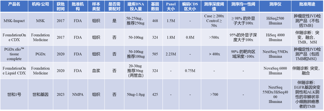 最近研究了一下已获批的5个大Panel产品,自2017年MSK-Impact和FoundationOne CDX先后获老美FDA批准,6年之后的2023年,NMPA终于批准了国内第一个大Panel-世和基因的世和1号。 5个大Panel相关的产品信息汇总如下: 汇总的几个要点如下: 除了FoundationOne Liquid CDX是基于血浆cfDNA样本的大Panel,其余都是基于组织样本的产品,国内还未有基于cfDNA样本的NGS产品获批。 除了MSI-Impact需要配对的正常组织或白细胞样本,其余都是Tumor-Only。 基于组织的大Panel建库投入量都需在50ng以上,根据MSK-Impact展示的数据,DNA投入量越高,测序成功率越高。 FoundationOne Liquid CDX是在FoundationOne CDX的基础上开发的Panel,基因个数也是324个,但是Panel并不完全一致,比如: 相比FoundationOne CDX,对下面粗体标记的75个基因(明显都是一些重要的热点基因如EGFR,KRAS,ALK等)区域的探针进行了加密,所谓加密就是多加探针,能对目标区域捕获更好,得到的深度更高; 另外两者的CDS区有所差异(0.75M VS 0.8M)。 所有大Panel基因个数都在300+,Panel大小都在1M以上; 基于组织的几个大Panel测序深度阈值之间有所差异,但目标测序深度应该都在500x以上。 FoundationOne liquid CDX的测序深度:看了一堆资料,硬是没有找到;不过国内相关的cfDNA大Panel测序深度普遍在5000x以上,参考其文章中给出的突变LOD在0.003左右,如果按照30ng投入量进行估算,5000x完全可以达到此LOD。 产品的测序平台都是基于Illumina平台的; 最有意思的是已获批的用途: 只有FoundationOne CDX,FoundationOne Liquid CDX,世和1号三个产品是严格意义上的伴随诊断产品,能获批伴随诊断的用途,说明产品在注册时不仅进行了相关指标的检测,还对指标相关的药物进行了临床实验,效果能达到预期。 比如世和1号的审评报告中: 虽然FoundationOne CDX已获批基于组织样本的TMB,MSI检测,但FoundationOne Liquid CDX只是获批了常规突变和融合的伴随诊断用途,基于cfDNA的bTMB以及MSI还未获批。 另外世和基因的大Panel只是获批了EGFR阴性和ALK阴性的非鳞状非小细胞肺癌的TMB,限定条件太多了。 限定条件即使如此之多,还花费了如此多时间和精力,注册绝非一朝一夕之事,必须经过严格的临床实验,脚踏实地的一步一步验证才可。 随便多加一个靶向药或者多加一个目标癌种,都需要多收集几十上百的样本,暂不说样本的收集难度,大Panel测序成本摆在那里,而且不仅测序还得花钱买药。。所以突变/融合指导的靶向药的注册大都转向了少于10个基因的小Panel,这个后边可以单独研究一下。 下面附几张产品参数图表: MSK-Impact的突变过滤参数: