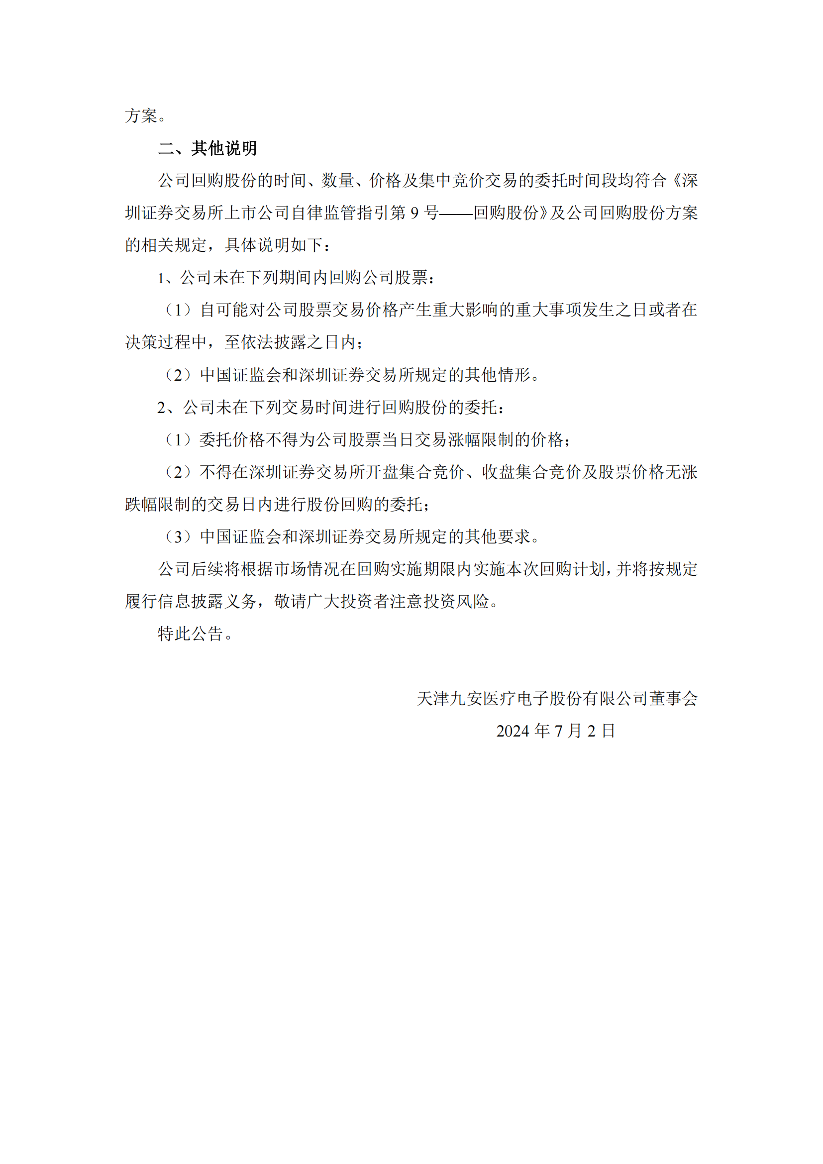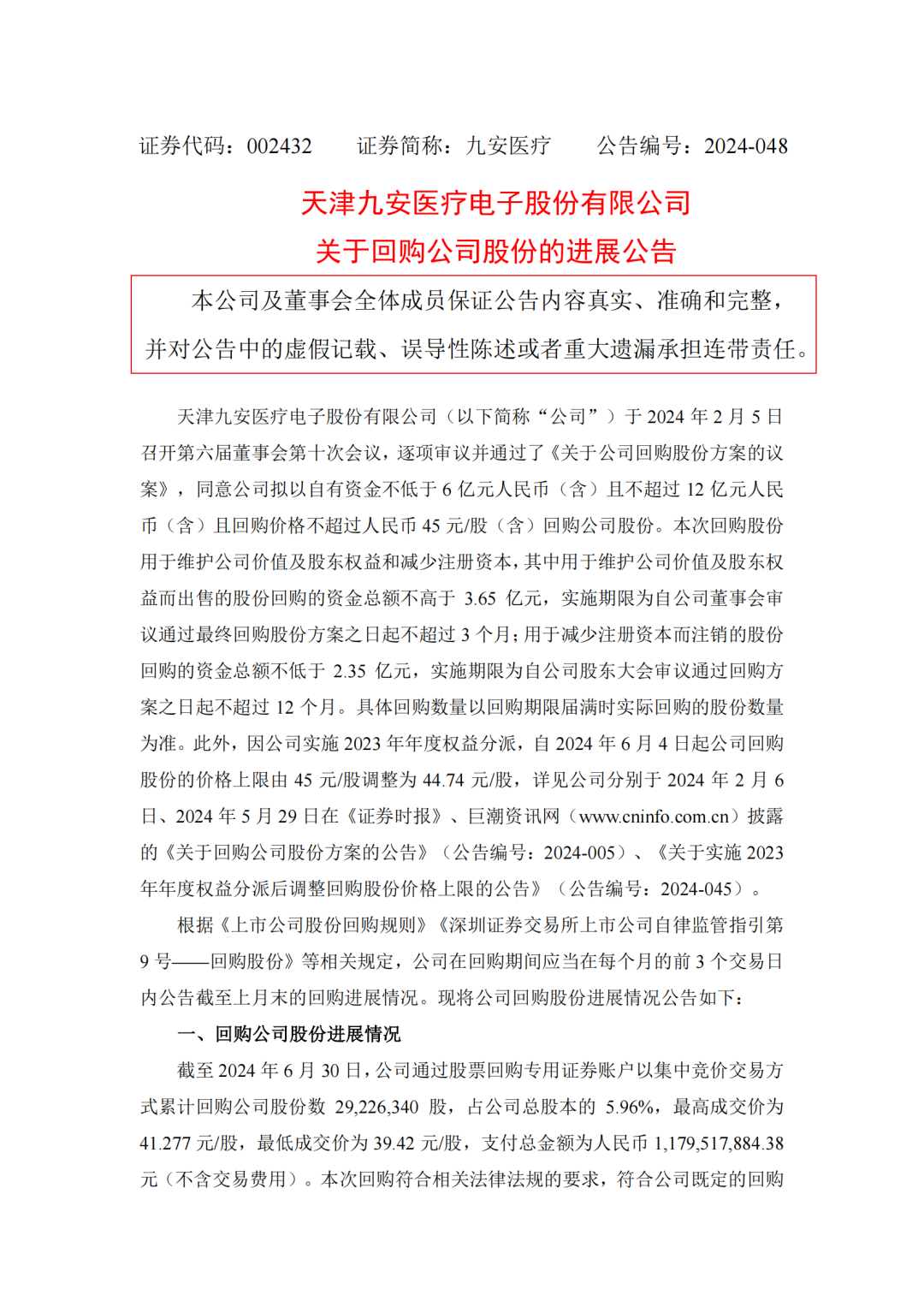 由于天津九安医疗电子股份有限公司(以下简称“公司”)最近二级市场股票价格已低于公司最近一期每股净资产,公司管理层认为股价已经偏离了公司基本面。为维护公司价值及股东权益、更好的回报股东,公司拟使用自有资金通过二级市场以集中竞价交易的方式回购公司部分社会公众股份(以下简称“本次回购”)。 本次回购的资金总额不低于6亿元人民币(含)且不超过12亿元人民币(含)。本次回购股份的价格为不超过人民币45元/股(含),若按回购资金总额上限和回购股份价格上限进行测算,预计可回购股份数量约为26,666,667股,约占公司当前总股本的5.46%;按回购资金总额下限和回购股份价格上限测算,预计可回购股份数量约为13,333,333股,约占公司当前总股本的2.73%,具体回购数量以回购期限届满时实际回购的股份数量为准。 本次回购股份用于维护公司价值及股东权益和减少注册资本,其中用于维护公司价值及股东权益而出售的股份回购的资金总额不高于3.65亿元,实施期限为自公司董事会审议通过最终回购股份方案之日起不超过3个月;用于减少注册资本而注销的股份回购的资金总额不低于2.35亿元,实施期限为自公司股东大会审议通过回购方案之日起不超过12个月。 来源:企业公告 |