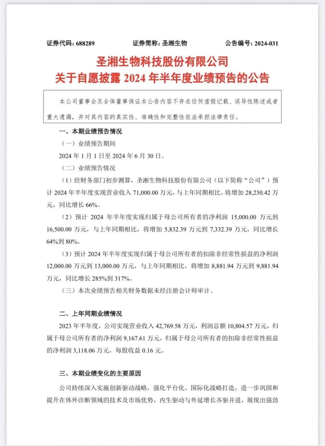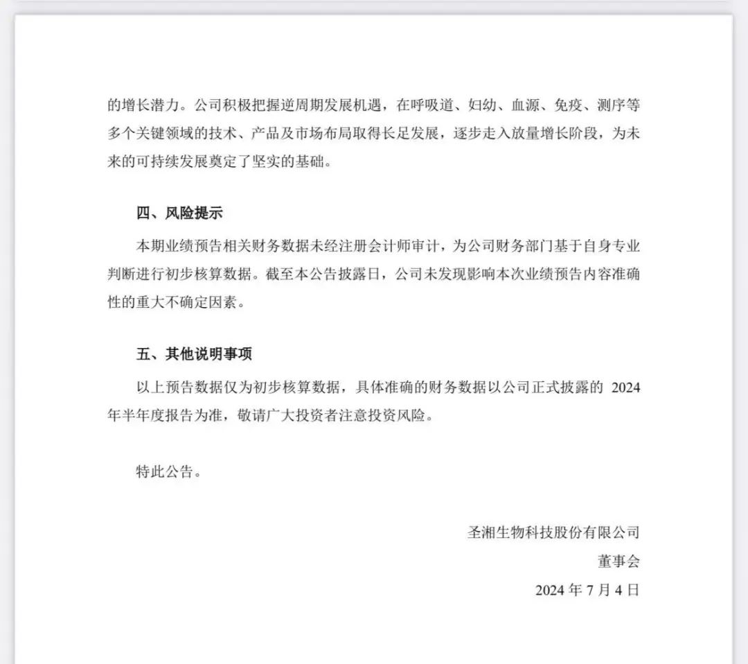 7月3日晚间,圣湘生物披露业绩预告。 预计上半年实现营业收入7.1亿元,同比增长66%; 归母净利润1.5-1.65亿元,同比增长64%-80%; 扣非净利润为1.2-1.3亿元,同比增长285%-317%。 今年上半年,圣湘生物继续以“创新+服务”双轮驱动,稳步推进平台化、国际化战略,进一步巩固和提升在体外诊断领域的技术及市场优势,展现出强劲的增长潜力。公司积极把握逆周期发展机遇,在呼吸道、妇幼、血源、免疫、测序等多个关键领域的技术取得突破性进展,推出了一系列产品矩阵丰富、竞争力突出的解决方案,市场开拓顺利进行,并获得了客户广泛认可。 此前,圣湘生物表示,呼吸道产线未来有望成为公司第一个达到10亿元体量的常规试剂产线。公司2023年年报显示,2023年呼吸道类产品营业收入超4亿元,同比增长达680%。据悉,今年上半年圣湘生物呼吸道类产品营业收入已与去年全年总额基本持平。 与此同时,圣湘生物进一步推动数智化领域的创新研发,已推出的“传染病数智化系统”广受好评。该系统能够通过统计终端检测数据,并依托AI模型技术分析预测传染病发展趋势,在医疗资源调配、卫生防控工作开展等方面提供有效帮助。 除了呼吸道疾病,圣湘生物在其他多个疾病检测领域也有广泛布局,并取得积极成果。在血源性产线领域,乙型肝炎病毒核糖核酸 (HBV RNA) 检测试剂盒 (PCR-荧光探针法) 通过国家药品监督管理局审核,获批上市。 血清HBV RNA是近年发展起来的HBV病毒学指标,该指标已写入多个国内、国外临床权威指南或专家共识,业内认为HBV RNA有力弥补了现有乙肝临床诊疗指标的不足,有望彻底改善慢乙肝诊疗现状。根据FDA要求,乙肝在研新药都需将HBV RNA作为疗效评估指标,随着这些药物的上市,公司HBV RNA伴随诊断产品也会迎来机遇。随着该检测试剂盒的获批,圣湘生物进一步完善肝炎全场景解决方案,作为国内乙肝分子检测市场占有率绝对领先地位的企业,有望快速实现市场覆盖,迎来新的增长点。 同时,圣湘生物与上海宏石共建的X-platform联合研发实验室在上海揭牌,双方将共同投入进行PCR的底层技术再开发,以创新驱动引领医疗行业新质生产力,强强联合共同推进医疗健康领域的技术应用发展。 在战略产线产品快速起量的同时,圣湘生物在化学发光、基因测序等领域的布局也取得突破性成果。 在化学发光领域,子公司安赛诊断在之前已获得心肌和炎症系列试剂产品证书的基础上,今年上半年又新获得了孕酮(Prog)和人绒毛膜促性腺激素(HCG)检测试剂注册证,产品矩阵进一步丰富,成功切入妇科疾病市场。据了解,安赛诊断目前也正在瞄准阿尔茨海默症检测等新兴领域,开发创新型的产品与解决方案。 在基因测序领域,圣湘生物推出的病原超多重靶向测序(tNGS)、病原宏基因组测序(mNGS)和病原全基因组(WGS)等多种检测技术,已运用于结核诊断及耐药防控、呼吸道感染、血流感染、中枢系统感染等多个临床重点及难点领域。 此外,2024年上半年,圣湘生物的结核分枝杆菌核酸检测试剂盒(PCR-荧光探针法)获得了欧盟 CE IVDR认证,标志着公司的结核产品在技术和质量方面达到国际先进水平,为欧盟市场开拓注入新动能。按照圣湘国际化战略,加速推进美国、法国、英国、印尼、泰国、沙特等深耕国家取得更大突破。 公告原文: |