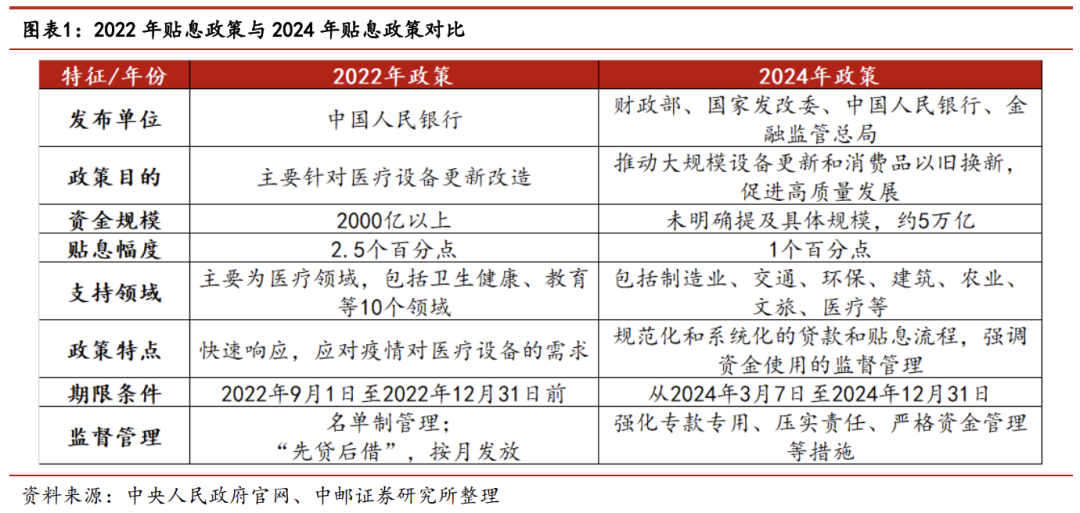 中邮证劵认为,此次设备更新贷款财政贴息政策是2022年底贴息贷款政策的延续,并在多个方面进行了优化和加强,包括更长的期限(2024年3月7日至2024年12月31日)、更明确的贴息流程等。