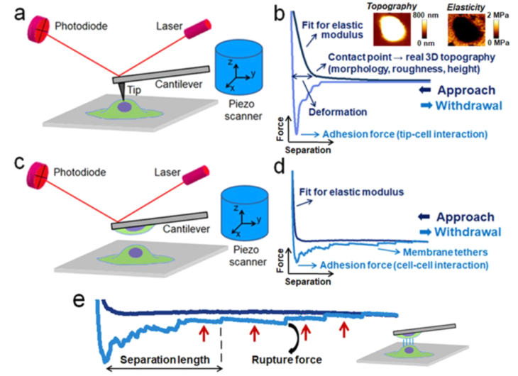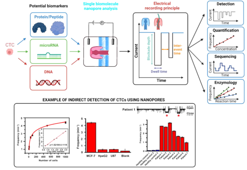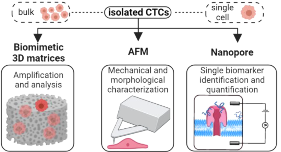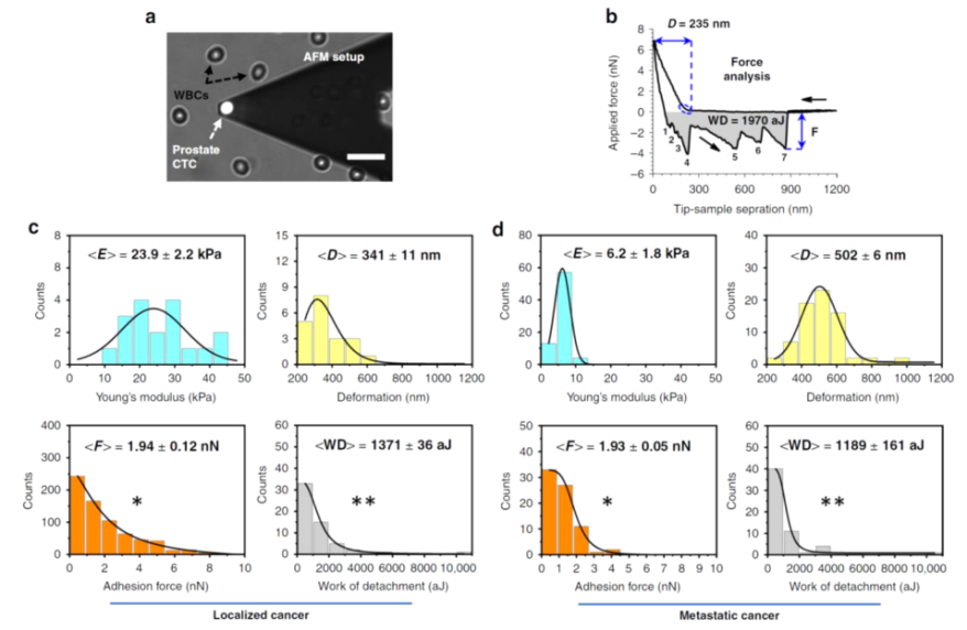 文章背景 循环中有肿瘤分离细胞(CTCs)的原发肿瘤、癌症或远处的肿瘤细胞,并进入患者的血流或淋巴系统。在外渗并在暴露于循环系统的压力下存活后,它们能够到达远处的器官。液体活检是一种微创采样方法,可用于癌症检测、预后、阐明复杂的化疗耐药机制和患者治疗管理,可以采取多种形式,包括但不限于尿液、脑脊液(CSF)和外周血样本。过去20年间,外周血样本在CTC富集/分离、检测和分选方面取得的技术进步引起了肿瘤科学界和肿瘤内科界越来越多的关注。虽然大量临床试验已经证明了CTC与预后的相关性,但其在诊断和治疗中的效用仍有待阐明。 文章内容 CTC是肿瘤诊断、预后和预测复发的生物标志物的有趣来源,但尽管在肿瘤生物学研究中对其进行了广泛研究,但其诊断效用尚未得到证实和验证。它们在人体生物体液中的稀缺阻碍了识别可能促进转移性播散的危险CTC亚群。在这一观点中,作者讨论了可能用于鉴定这些转移细胞的有前景的技术。首先描述了分离患者来源的CTC的方法,然后在扩增和分析中使用3D仿生基质,然后描述了在单细胞和单分子水平进一步分析CTC的方法。最后,讨论了未来如何结合使用原子力显微镜等技术来阐明机械和形态性质,以及使用基于纳米孔的检测来识别分子生物标志物,从而为患者和他们的医疗保健提供者提供更准确的诊断。 目前CTC富集和分选的方法,及有前景的分析技术 液体活检采集后,CTC富集主要依赖于生物物理学(无标记)或生物学(依赖标记)特性。依赖标记的技术通常涉及基于正或负亲和力的捕获,可以在试管(RosetteSep)或微流控通道(CellSearch或CTCChip)中进行。目前一些无标记技术是基于微过滤(ISET)和微流控设备(Labyrinth chip, Parsortix)的尺寸和变形性,或基于密度的梯度离心(Ficoll-Paque)或双向电泳(DEPArray)。一旦恢复,ctc可以使用仿生3D基质、原子力显微镜(AFM)和纳米孔技术进行扩增和分析。 含CTCs的三维细胞培养支架的制备策略及其相关应用 非细胞毒性水凝胶的日益增加在3D细胞培养新材料的开发和使用中发挥了核心作用。能够定制水凝胶成分、几何形状和大孔隙度的材料制造策略的兴起,为特定细胞类型构建相关环境开辟了令人兴奋的新途径。将CTC整合到这些材料中提供了解决药物筛选、CTC扩展或细化肿瘤发生模型等应用的可能性。虚线内是3D(生物)打印和冰模板,这两种技术有望在未来ctc的3D细胞培养支架的开发中发挥核心作用。 用于三维癌细胞培养的湿法和基于支架的方法例子 (a)BrCa患者ctc形成的球体荧光图像,CD44(干细胞标志物,上图)和波形蛋白(间质标志物,下图)均为阳性。比例尺100 μm。(b)来自PDAC患者的ctc衍生类器官的共聚焦图像;泛ck,绿色/DAPI,蓝色。刻度杆为10 μm。(c)第14天,在盐浸PCL支架(黄色箭头)中培养的mBRCA患者样本的红细胞(RBC)去除有核细胞扫描电子显微镜(SEM)图像。细胞间的接触由红色箭头表示。比例尺100 μm。(d)培养第3天,ha修饰PLGA NFs的相位衬度图像与加标HeLa细胞的荧光图像叠加在NFs上。 AFM原理及不同样品性质的提取 a, c. AFM原理:一端有尖端(a)或细胞(c)的悬臂与样品相互作用。悬臂的偏转由激光束监测,激光束从悬臂反射并指向光电二极管。尖端与样品的相互作用导至悬臂梁偏转和随后的激光束偏转,这被光电二极管记录下来,提供电信号作为输出。压电元件精确地控制悬臂梁相对于样品的运动。b, d.分析尖端-细胞(b)和细胞-细胞(d)相互作用的合力曲线,以提取样品的多种属性。逼近力曲线提供了样品形态(b)和力学性能(b, d)的信息。根据力曲线计算得到的高分辨率的形貌和弹性模量图(15 × 15 μm2)显示了(b)。撤回力曲线包含了悬臂与样品之间的相互作用(b, d)和膜系形成(d)的信息。直接计算系绳的数量,分离长度,和破裂力是可能的,从力曲线。 微流控捕获的局部和转移癌患者完整前列腺CTCs的AFM分析 a.显微图显示AFM尖端位于epcam染色的CTC中心上方,这样力的测量可以用于后续的纳米力学表征。比例尺30 μm。b. AFM尖端与CTC相互作用的代表性力曲线,其中黑色箭头表示尖端靠近细胞表面和从细胞表面回缩的方向。在初始尖端-胞体表面接触后,由于施加的恒定载荷,胞体会经历一定量的表面变形D。当尖端从细胞表面缩回时,由于与AFM尖端表面的相互作用,细胞会经历许多粘附力F(缩回过程中的峰值为1 - 7),直到尖端完全脱离。在这个过程中,脱离的工作“WD”(零力线以下的灰色阴影区域)表示完全脱离细胞表面所需的工作量。c, d.测量局限性(n = 3)和转移性(n = 2)肿瘤来源的ctc的所有杨氏模量E、变形量d、粘附力F和脱离WD的功的分布直方图。实黑线是拟合对数正态或高斯概率密度函数的数据。 纳米孔用于ctc表征的应用 从原发肿瘤中分离的ctc可以恢复并在单细胞水平进行分析。提取的CTC生物标志物包括(1)蛋白质/肽,(2)微rnas和(3)DNA,然后可以使用纳米孔技术分析。在纳米孔实验中,一个含有纳米大小孔的绝缘膜被放置在两个充满电解质的隔间之间。当电压跨膜施加时,离子电流通过纳米孔(蓝色的孔)。通过孔的运输或相互作用引起电流的减少,由于离子运输的部分阻断(红色孔)。阻断电流的深度和持续时间取决于分子的化学性质、构象、大小和序列,但也取决于孔的几何形状。单生物分子纳米孔分析的应用包括潜在生物标志物检测、定量、测序和酶促反应测定。CTC检测已经通过纳米