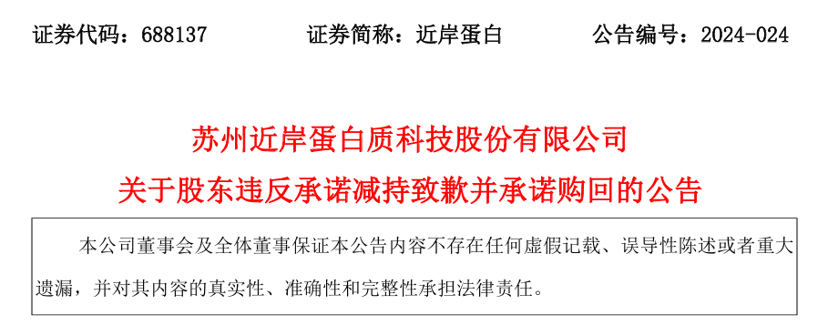 | 7月8日晚间,近岸蛋白发布公告称,公司于近日收到公司股东杭州畅遂股权投资合伙企业(有限合伙)(以下简称“杭州畅遂”)和淄博璟丽创业投资合伙企业(有限合伙)(以下简称“淄博璟丽”)送达的《关于减持苏州近岸蛋白质科技股份有限公司股票的情况说明》。 据了解,杭州畅遂和淄博璟丽为持有公司首次公开发行限售股的股东,于本次减持前,杭州畅遂、淄博璟丽分别持有公司 0.375%股票。杭州畅遂、淄博璟丽在公司招股书等文件中作出承诺,“承诺人保证减持发行人股份的行为将严格遵守中国证监会、上海证券交易所相关法律、法规的规定,并提前三个交易日公告”。杭州畅遂、淄博璟丽持有的近岸蛋白股票于6月26日解禁,杭州畅遂、淄博璟丽的股东于6月20日指示工作人员准备进行减持,同时,杭州畅遂、淄博璟丽于6月21日通知近岸蛋白拟减持所持股票。 近岸蛋白表示,由于上述股东工作人员未充分关注到杭州畅遂、淄博璟丽在公司招股书等文件中所作出的承诺,以及杭州畅遂、淄博璟丽内部信息沟通不及时,杭州畅遂于6月26日至7月1日期间通过集中竞价合计减持近岸蛋白股份约14.85万股,减持金额约480万元,未提前三个交易日披露减持计划;淄博璟丽于6月26日至6月28日期间通过集中竞价合计减持近岸蛋白股份约16.02万股,减持金额约517万元,未提前三个交易日披露减持计划。 此外,近岸蛋白还表示,杭州畅遂和淄博璟丽对此次违反承诺的减持行为深表歉意,杭州畅遂和淄博璟丽及相关责任人员已进行了深刻反省,并承诺加强风控管理以及对证券法规的学习。杭州畅遂和淄博璟丽承诺在规则允许的范围内,尽快购回违规减持近岸蛋白的股份,并承诺将购回股份产生的收益(如有)全部缴纳至近岸蛋白指定账户。 |