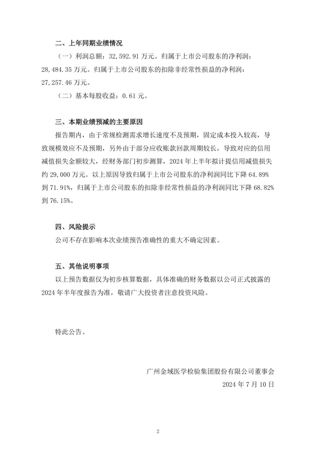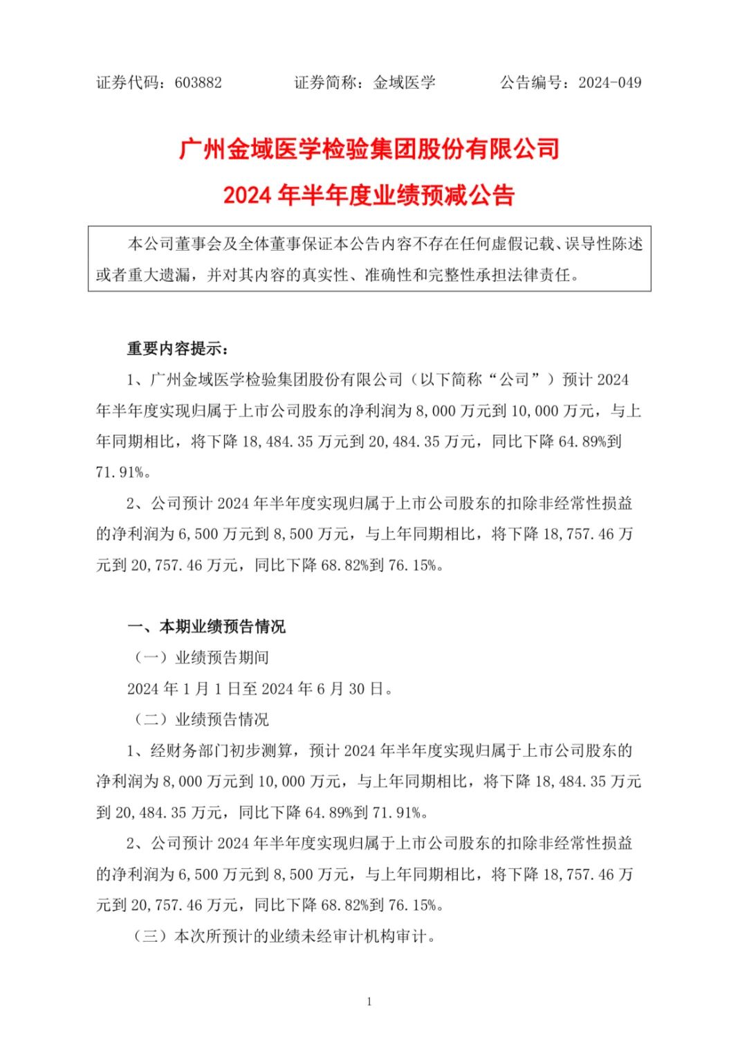 7月10日金域医学发布《广州金域医学检验集团股份有限公司2024年半年度业绩预减公告》,公司预计2024年半年度实现归属于上市公司股东的净利润为8000万元到10000万元,与上年同期相比,将下降18484.35万元到20484.35万元,同比下降64.89%到71.91%。 公司预计2024年半年度实现归属于上市公司股东的扣除非经常性损益的净利润为6500万元到8500万元,与上年同期相比,将下降18757.46万元到20757.46万元,同比下降68.82%到76.15%。 报告期内,由于常规检测需求增长速度不及预期,固定成本投入较高,导至规模效应不及预期,另外由于部分应收账款回款周期较长,导至对应的信用减值损失金额较大,经财务部门初步测算,2024年上半年拟计提信用减值损失约29000万元。以上原因导至归属于上市公司股东的净利润同比下降64.89%到71.91%,归属于上市公司股东的扣除非经常性损益的净利润同比下降68.82%到76.15%。 |