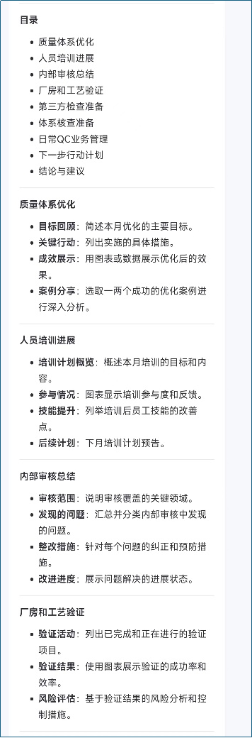 “我是一家IVD公司的质量经理。上个月我的工作主要从质量体系优化,人员培训,内部审核,厂房和工艺验证,第三方检查准备,体系核查准备及日常qc业务管理等方面。帮我整理一个月报的ppt。”