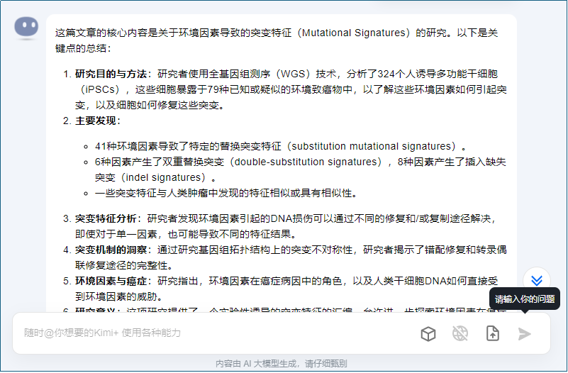 ■ 翻译文献:在线翻译这一块,对于医疗行业而言需求还是很多的,之前也已经有很多翻译工具,而AI的到来将我们和国外的距离进一步的缩短了。除了翻译之外,AI还可以概括全文,让你在很短的时间内了解文章的全貌。这里小编举了一个例子是通过Kimi.ai完成的,文章发表在cell,讲述不同环境因素产生的癌症可能具有不同的特征的故事,AI概括的内容如下:
