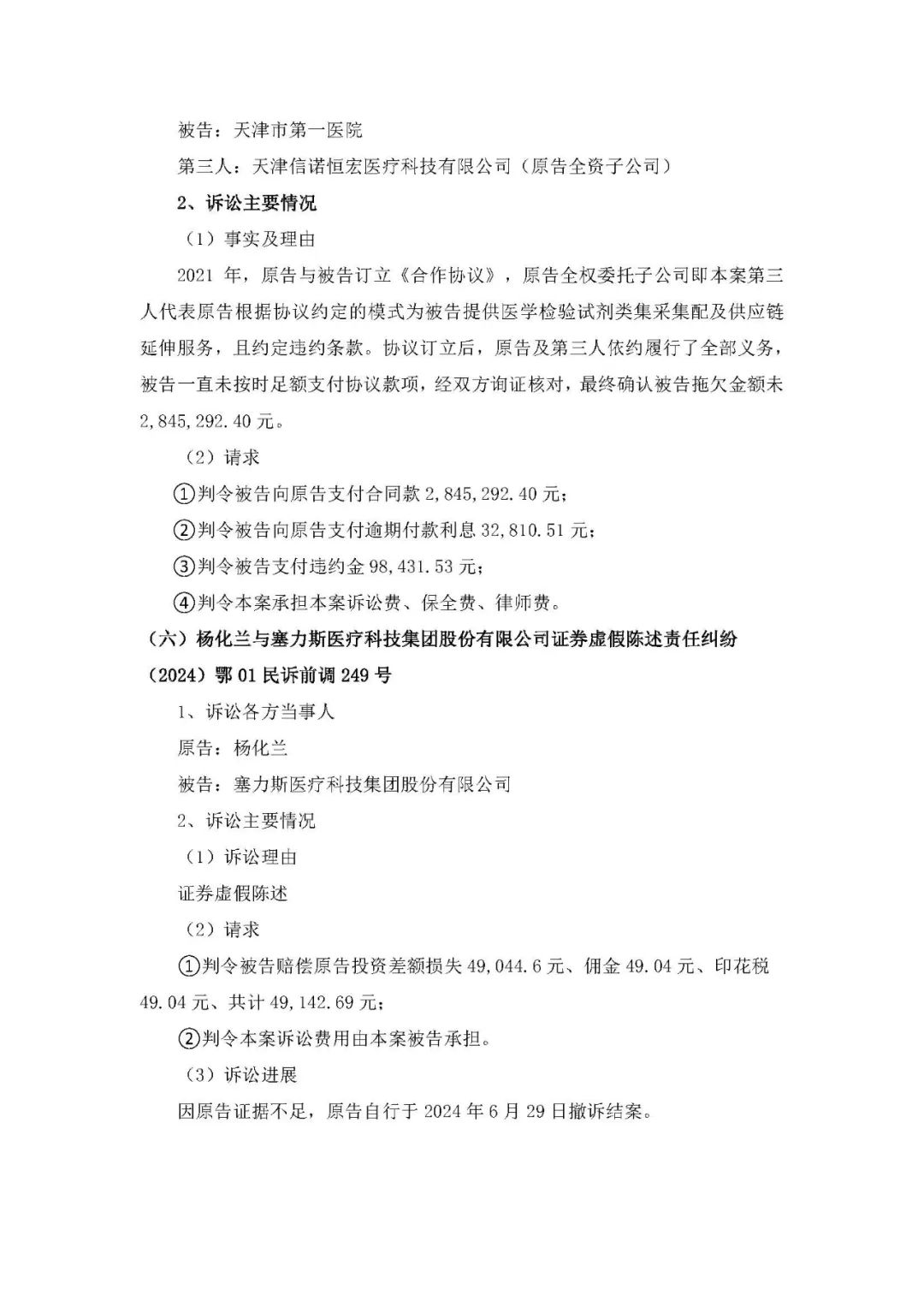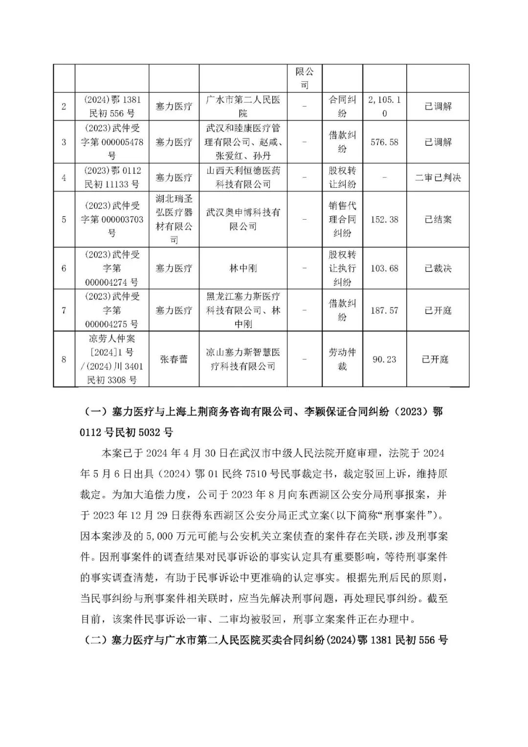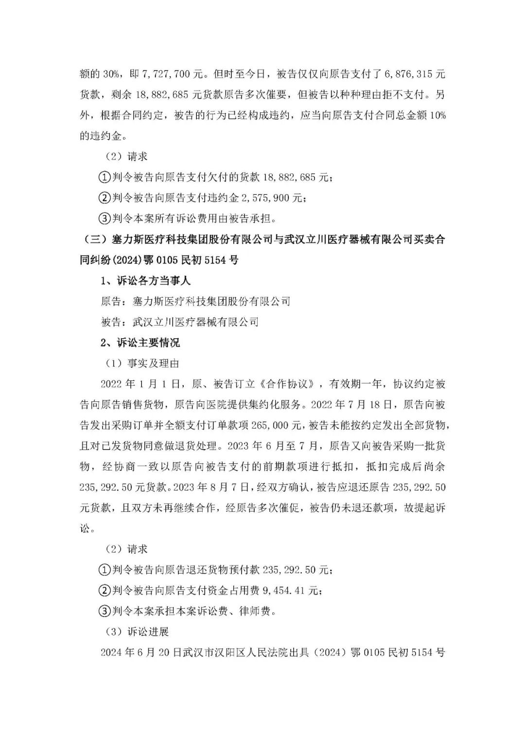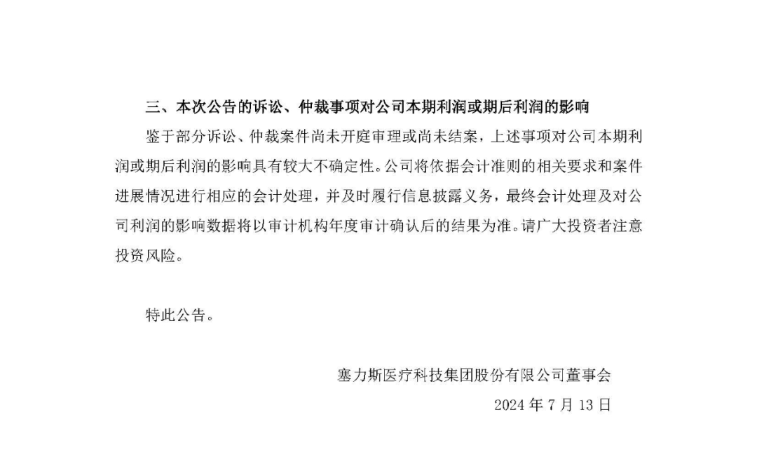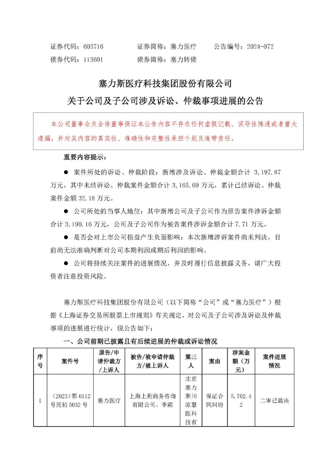 7月13日,塞力医疗披露公司涉诉情况显示,新增涉及诉讼、仲裁金额合计 3,197.87万元,其中未结诉讼、仲裁案件金额合计3,165.69 万元 ,累计已结诉讼、仲裁案件金额32.18 万元。公司前期已披露且有后续进展的仲裁或诉讼情况有8起;本次新增诉讼案件的基本情况也包含8起。涉及到劳动仲裁、合同纠纷、借款纠纷、股权转让纠纷等。 塞力医疗成立于2004,总部位于湖北武汉,于2016年上市,是中部地区首家沪市主板上市的医疗集约化运营服务提供商。公司一直深耕于医疗集约化运营管理服务领域,与国内外知名IVD供应商建立了长期良好的合作关系,覆盖了医疗机构所需的全采购品类,能满足医疗机构对体外诊断产品的一站式需求。 2023年,塞力医疗实现营收20.06亿元,同比下降13.10%;归母净利润亏损1.59亿元。其中IVD和SPD业务营收占比分别为35.86%、36.93%。 IVD快讯特成立IVD企业高管交流群,交流IVD行业热点,赶快扫码进群吧!若二维码失效,请扫描文末二维码,添加小编个人微信,小编将邀请您进群。 来源:IVD资讯、塞力医疗 编辑:小墨 审校:小实 声明:注明来源的文章均为转载,仅用于分享,不代表平台立场,如涉及版权等问题,请尽快联系我们,我们第一时间更正,谢谢! |