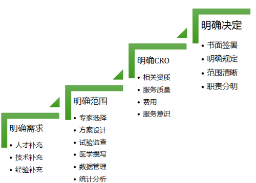 选择CRO的步骤 作为企业,应该制定清晰的合作计划,具体可采取“三步法”。首先,明确企业本身所需要的CRO公司的哪种服务或者资源;然后,获得可提供相应服务的CRO公司名单;最后,筛选合适的公司,双方进行洽谈,确立合作。在这个过程中,如何对入选的CRO公司进行评价尤为关键。赵冰总监认为对CRO的优劣评价应该着重以下几个方面: 1.公司人员组成:中上层的管理者素质通常很高,但实际操作人员往往不会是与你洽谈合同的人,需要注意这两者之间的差异。 2.人员流动性:项目直接接触的监查员和项目经理很重要,毕竟上层的流动可以由管理而迅速解决,而实际操作人员的变动给医生带来的麻烦是比较棘手的。 3.公司科研经验:首先要有监查的经验,然后再是相关项目经验。 4.资源优势:与合作医院的关系、医药系统的人脉关系 5.风险承担能力:也就是财务状况,严谨的讲,企业在合作中承担的风险最大,但如果CRO的资金实力不足,将更加扩大风险值。 6.保密机制:CRO公司必须要有完善的保密机制,确保申办者的利益。 此外,合作结束后,最终如何评估合作后的结果呢?赵冰总监认为可以从几个方面进行考量,包括工作时间表和质量报告以及文档完成情况、国家注册法规/GCP的依从情况、合作中,发现问题和解决问题能力及费用价值等。