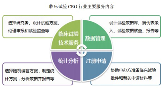 临床试验 CRO 的服务主要包括临床试验技术服务、数据管理、统计分析以及注册申请四个方面。其中,临床试验技术服务是临床试验 CRO 企业提供的最主要服务,覆盖了 I 至 IV 期临床试验,工作内容涉及临床试验的全过程。 临床试验数据管理服务负责设计符合临床试验方案要求的试验数据库系统,将病例报告表里的各项数据双份录入到数据库中,并对试验数据进行程序化和手工核查,并在盲态核查后进行锁定,提供药品审评单位所需的试验数据库。 临床试验统计分析服务包括选择随机编盲方案,制定统计方案以及分析数据报告等。 注册申请相关服务是按照药品监管机构的要求,协助申办者准备临床试验申请和药品注册申请所需的相关资料,提供注册申请过程及注册法规的咨询服务,同时也可以为申办者提供药品注册相关专业资料的翻译等。 CRO行业正快速成长 随着大批重磅药品专利到期,医药企业不得不加大新药研发的速度以应对收入锐减的窘境。在这过程中,药物监管机构不断提高新药研发的要求,药物审批程序愈加严格也从成了药企的绊脚石。 受益于这样良好的外部环境,CRO 行业在不到40 年的时间内快速成长为医药研发产业链上不可或缺的重要一环。不同领域的CRO公司可提供专业化高效率服务,分解研发活动的复杂性,缩短研发周期; CRO 公司还可以提供较低成本的人力资源,减少高额研发成本。 根据Frost & Sullivan 的统计,目前CRO 行业已经承担了全球将近1/3 的新药研究开发工作。在全球生物医药领域,CRO 公司的数量已超过1100家,其中排名靠前的昆泰(Quintiles Transnational)、科文斯(Covance)、PPD、查尔斯河实验室(Charles River Labs)和百瑞精鼎(Parexel)的年营业收入均已突破10 亿美元。 据《2014-2018年中国医药研发外包(CRO)产业运营态势与发展前景预测报告》显示,2010 年全球CRO 行业的市场容量为232 亿美元,2011 年至2016 年,全球CRO 行业市场将保持10%左右的年均增长速度,至2016 年,全球CRO 行业的市场容量将有望达到426 亿美元。
