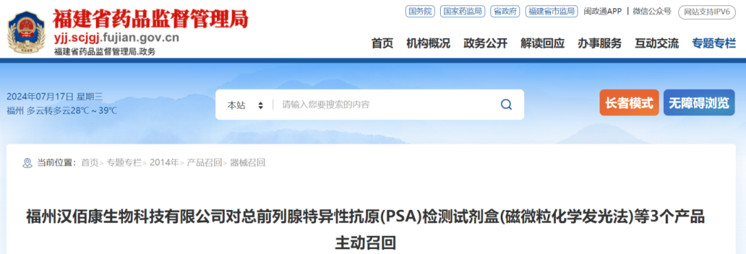 7月16日,福建省药监局发布一则医疗器械召回信息。因为在未完成许可变更期间生产销售新增品种,福州汉佰康生物科技有限公司对总前列腺特异性抗原(PSA)检测试剂盒(磁微粒化学发光法)等3款医疗器械产品在相应销售范围实施主动召回。该公司表示,将对上述3款召回产品进行封存、销毁。经查,福州汉佰康生物科技有限公司生产销售的总前列腺特异性抗原(PSA)检测试剂盒(磁微粒化学发光法)、游离前列腺特异性抗原(f-PSA)检测试剂盒(磁微粒化学发光法)、甲胎蛋白(AFP)检测试剂盒(磁微粒化学发光法)为新增品种,在未完成许可变更期间生产销售了上述产品,7月15日起,企业按规定主动联系经销商、客户,对其上述产品实施主动召回,召回级别均为三级。依据《福州汉佰康生物科技有限公司召回事件报告表》,此次召回的总前列腺特异性抗原(PSA)检测试剂盒用于体外定量检测人血清或血浆样本中总前列腺特异性抗原(PSA)的浓度,临床上主要用于前列腺疾病的辅助诊断及鉴别诊断等,涉及产品型号、规格为100测试/盒,2批次(2023090101、2023111701)共5盒,产品召回涉及范围包括湖南、福建、辽宁三省。此次召回的游离前列腺特异性抗原(f-PSA)检测试剂盒用于体外定量检测人血清、血浆样本中游离前列腺抗原(f-PSA)的浓度,涉及产品型号、规格为100测试/盒,2批次(2023090401、2023111701)共4盒,产品召回涉及范围包括福建省、辽宁省。此次召回的甲胎蛋白(AFP)检测试剂盒用于体外定量检测人血清、血浆样本中甲胎蛋白的浓度,临床上主要用于对恶性肿瘤患者进行动态监测以辅助判断疾病进程或治疗效果,不能作为恶性肿瘤早期诊断或确诊的依据,不能用于普通人群的肿瘤筛查,涉及产品型号、规格为100测试/盒,3批次(2023070501、2023081001、2023110301)共27盒,产品召回涉及范围包括湖南、福建、辽宁三省。福州汉佰康生物科技有限公司是一家专业从事医学尿液检测诊断仪器设备、配套检测用检测试纸条、试剂盒、鞘液、清洗液以及目前国内独创的尿液试纸条产品检测评价的质控品等产品等研发、生产和销售并提供相关技术服务的高科技生产企业。