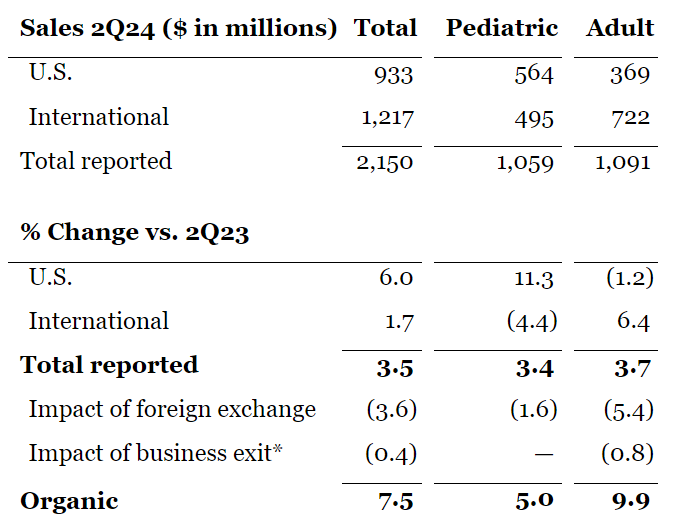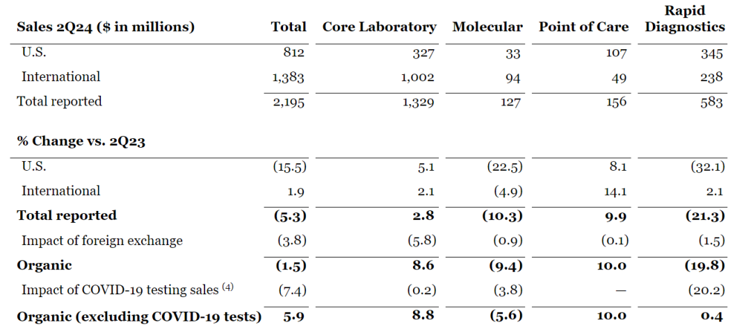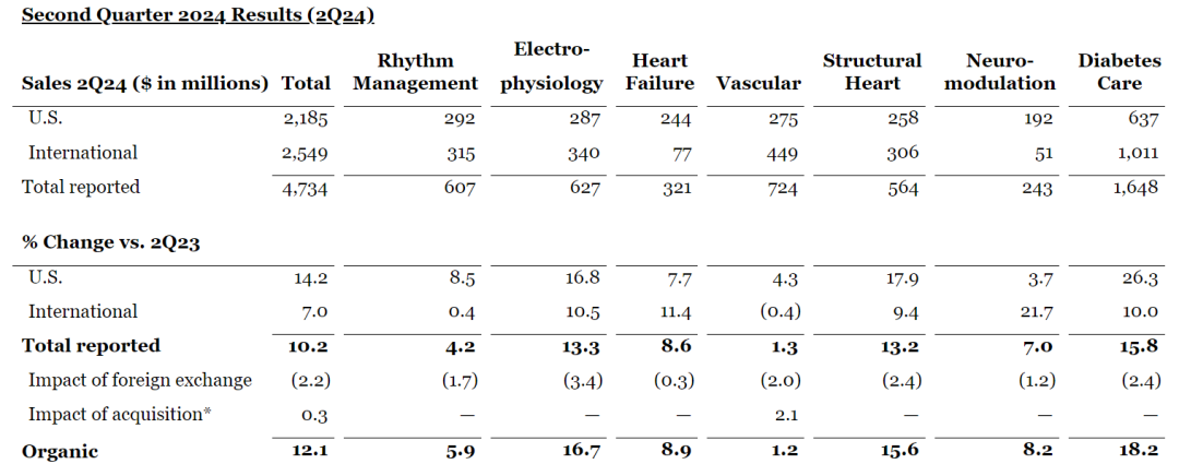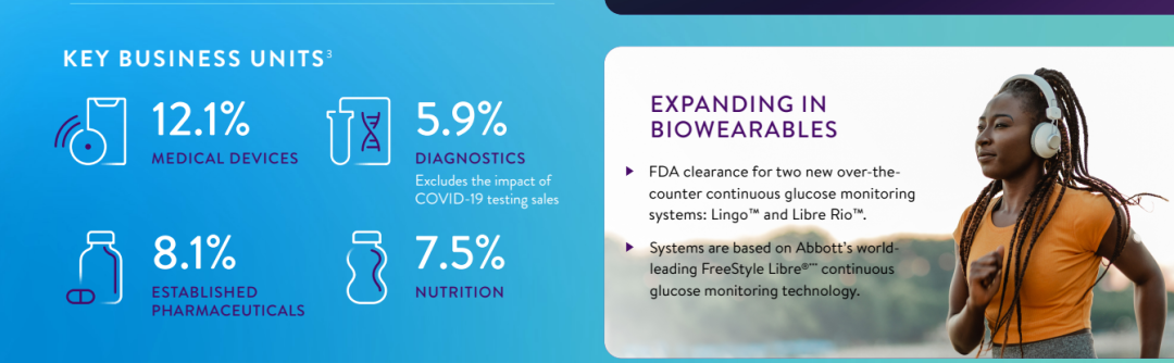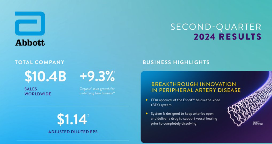 2024年7月18日,雅培发布最新第二季度业绩,并上调了全年利润预期。 雅培第二季度总营收约103.8亿美元(合约753.58亿人民币); 基础业务的有机销售额增长 9.3%。报告销售额增长4.0%; 雅培调整后每股摊薄收益为1.14美元(GAAP摊薄每股收益为0.74美元); 基于公司今年迄今为止的强劲表现,雅培上调了2024年全年每股收益指引。 雅培目前预计全年调整后摊薄后每股收益为4.61美元至4.71美元(根据GAAP计算,2024年全年摊薄后每股收益为3.30美元至3.40美元)。 雅培将 2024 年全年有机销售额增长指导范围(不包括 COVID-19 检测相关销售额)收窄至 9.5% 至 10%,这代表了该区间中点的增长。 本季度的业务亮点包括: 医疗器械业务 第二季度全球医疗器械有机销售额增长12.1%; 糖尿病护理、电生理学和结构性心脏业务的两位数增长是关键引擎。最近推出的几款产品做出了贡献,包括 Amplatzer® Amulet® 、Navitor® 、TriClip® 和 AVEIR® ; 电生理学业务的销售额在有机基础上增长了16.7%,其中包括导管和心脏标测相关产品实现两位数增长,以及所有主要地理区域实现两位数增长。 在糖尿病护理方面,FreeStyle Libre 的销售额达到16亿美元,在有机基础上增长了20.4%。 营养业务 第二季度全球营养品有机销售额增长7.5%。 儿科营养品业务,全球销售额按有机计算增长5.0%,美国的销售额反映了婴儿配方奶粉业务市场份额的持续增长; 成人营养品业务,全球销售额有机销售额增长9.9%。 诊断业务 2024 年第二季度全球 COVID-19 检测销售额为 1.02 亿美元,而去年第二季度为 2.63 亿美元。 不包括与COVID-19检测相关的销售额,全球诊断销售额在有机基础上增长了5.9%。 不包括与COVID-19检测相关的销售额,全球核心实验室诊断业务的销售额在有机基础上增长了8.8%,这得益于雅培Alinity® 系列诊断系统和检测产品组合的强力拉动。 制药业务 第二季度制药业务的销售额在有机基础上增长8.1%。 主要新兴市场包括几个新兴国家,这些地区的销售额在有机基础上增长了8.8%,这主要得益于包括心脏代谢学、胃肠病学和中枢神经系统/疼痛管理等领域的强劲增长。