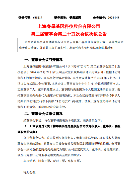 7月23日,睿昂基因发布《上海睿昂基因科技股份有限公司第二届董事会第二十五次会议决议公告》,具体内容如下: