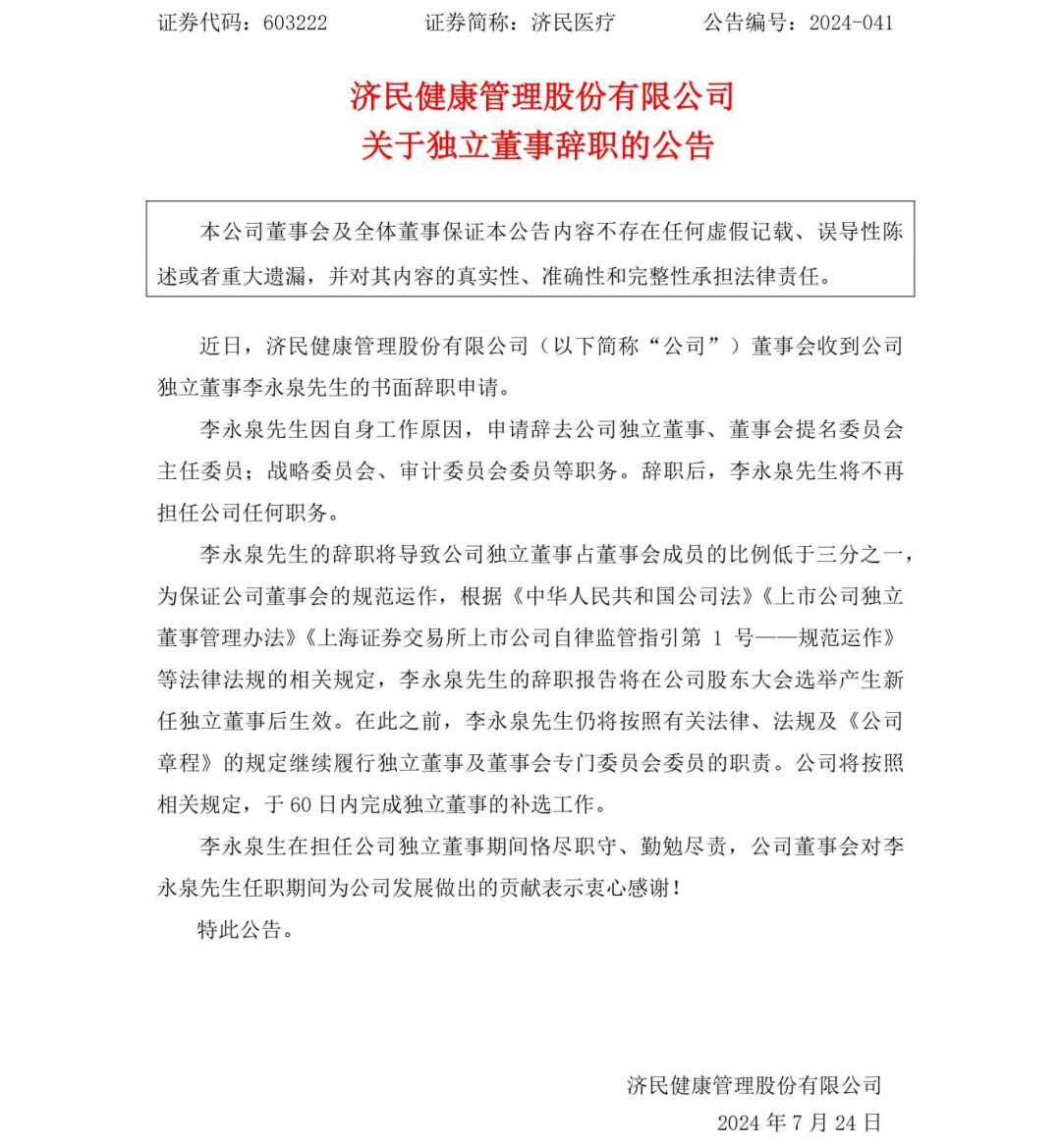 | 7月23日济民医疗发布公告,济民健康管理股份有限公司董事会收到公司独立董事李永泉先生的书面辞职申请。
