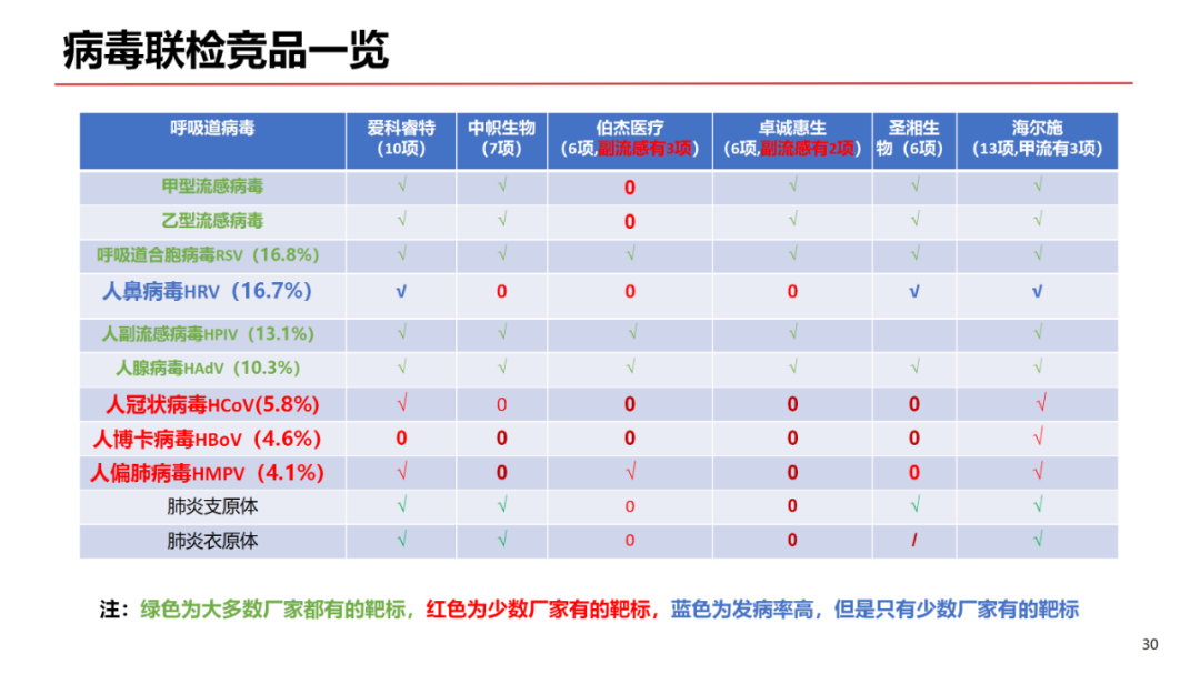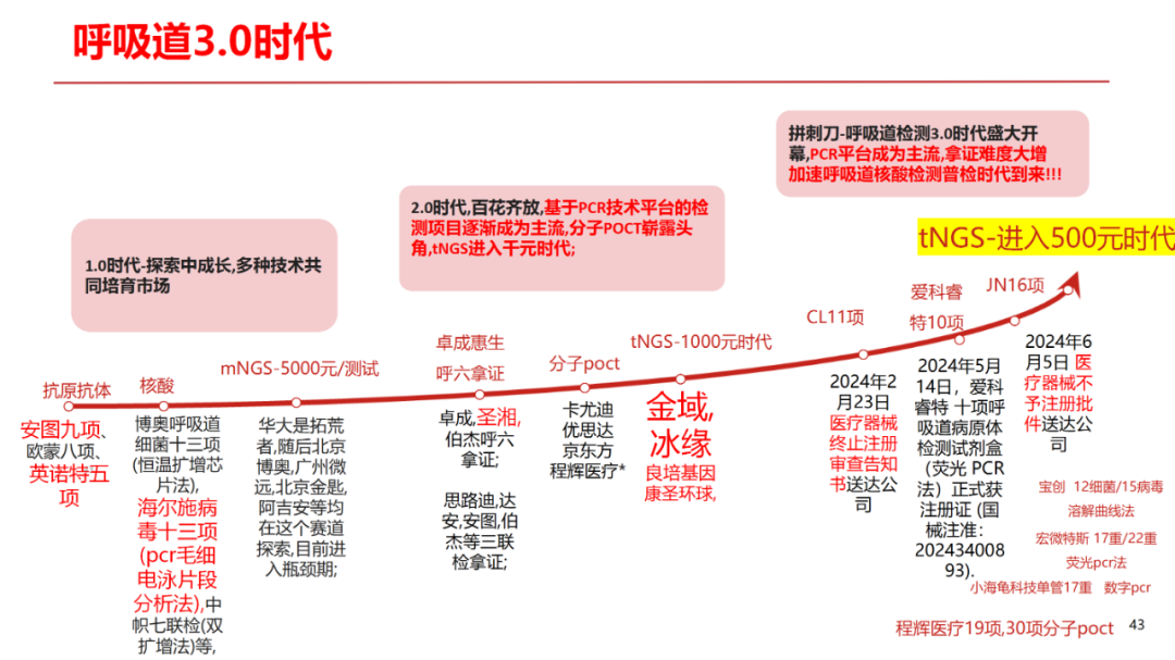核心观点: 1.呼吸道检测时指数级增长的黄金赛道: 呼吸道传染病发病人数在中国常居高位,2023年呼吸道感染人数创十年最高,呼吸道检测提前布局的厂家和代理商从业者均实现了利润倍增,甚至对企业上市有较大贡献者拿到股票已实现财富自由,未来呼吸道检测赛道会像HPV赛道一样涌现出更多上市企业; 2.门诊和住院场景的需求本质上是一致的:检测快,结果准,靶标覆盖全,性价比高且符合DRGs要求;依照门诊和住院场景对出报告时间能容忍的时长,当下和未来几年最可能压到宝的两类产品:门诊是超多重分子POCT(参考文章:呼吸道感染病原体检测的现在和未来)或一两小时出报告的超多重PCR试剂盒,住院部是tNGS+一两家超多重PCR试剂; 3.产品快速迭代不断冲击既有利益厂家和代理商,如何在呼吸道3.0时代站着挣钱,请再次阅读上面第二条或者正文详情. 1.0时代-探索中成长,多种技术共同培育市场 大致在2021年卓成惠生呼吸道病毒核酸六重联检试剂盒拿证前,是遍地黄金的呼吸道检测1.0时代,市场在培育期,各种方法学的试剂盒都有自己的应用场景和营销模式. 呼吸道病原抗体检测代表性产品:安图九项、欧蒙八项、英诺特五项,英诺特的呼吸道抗原系列产品助力公司成功在资本市场敲钟上市; 呼吸道核酸检测代表产品:博奥呼吸道细菌十三项(恒温扩增芯片法),海尔施病毒十三项(pcr毛细电泳片段分析法),中帜七联检(双扩增法)等,老板们在同一赛道用不同的检测平台和试剂方法来探索这个赛道,并实现了大丰收; 病原微生物宏基因组测序代表厂家:华大是拓荒者,随后北京博奥,广州微远,北京金匙,阿吉安等均在这个赛道探索,一网打尽所有已知微生物,对于危急重症患者获益较大,这一时期也赚得盆满钵满,此方法学检测到了新冠病毒,对疫情防控起到非常积极的作用; 2.0时代,百花齐放,基于PCR技术平台的检测项目逐渐成为主流,tNGS异军突起 受PCR仪器大量装机和分子技术进步,分子检测逐渐成为呼吸道核酸检测的主流,这一时期出现了大量3项联检的小组合,6项联检的大组合, 同时卡尤迪,赛沛等分子POCT仪器+呼吸道分子快检试剂组合,抢走了大三甲门诊抗体的部分市场; tNGS崛起重创mNGS市场,tNGS把价格打到千元以内,并在院内切走大量呼六和海尔施的市场,金域操盘tNGS一骑绝尘,优点多多,缺点是几乎无法拿证,但在医院端通过建库试剂盒报证和销售,并在部分省份成功申报物价,tNGS是把医疗本质看得最明白并且落实最到位的品类,并将长期大放光彩. 经历过呼吸道1.0和2.0时代的攻城略地或者看着别人挣钱却发现介入晚了没机会参与,那么在呼吸道3.0时代,如何跟上趋势选好产品站着把钱挣了,就成为考验医疗从业者的重大课题,一念之差就是失之毫厘,谬以千里. 呼吸道3.0时代,内卷(IVD将卷向何方?)中充满希望,把握医疗的本质和趋势,结合产品的优劣势,1.0和2.0时代的产品,仍旧有好的应用场景 抗原抗体产品辉逐渐从大三甲医院萎缩,其国内主要市场辉逐步下沉到社区服务中心和卫生院,放眼全球,应诺特和康华生物等的产品依旧有无限生机,非洲和欧美的市场是国内的N倍,出海赚全世界的钱. 同时,非基于PCR平台的特殊方法学的长多重呼吸道产品,接下来面临着产品升级的压力,如海尔施基于一代测序仪拓展产品线,HPV E6E7 就卖的不错,后续还有重磅产品脑膜炎快拿证了,据说海尔施也在申报基于PCR的呼吸道联检试剂盒,海尔施医疗端的业务的前景依旧长期看好. 基于PCR技术的呼六产品,日子也会不好过,在住院部卷不过超多重和tNGS,在门诊又达不到较高的阳性率(价格偏高但有很大比例的阴性报告),让门诊医生很头痛,sx公司在门诊的推广尝试较多,并在个别医院树立了还不错的标杆,但成功太偶然不能广泛复制,内卷之下,呼六可能会被迫走上降价这条不归路,或许海外市场有呼六大展拳脚的地方. 在门诊,卡尤迪,优思达等小联检或者单检的分子POCT会继续增长,但未来的趋势或者眼下就会有超多重分子POCT的产品或者满足超多重核酸+快速出报告的产品出现,门诊快速超多重核酸检测产品即将开启门诊超多重核酸普检时代. 在住院部,现在或者未来会占领呼吸道核酸检测制高点的产品依旧是tNGS,成本已经降到50元,收费下探到500元以下,在住院部给其它产品都画上了一条不可逾越的鸿沟,要更快速,要超多重联检,要更便宜,缺一不可,只有超多重PCR在出报告时间上有明显优势,可以分到住院部部分危急重症的样本,在实际应用中,超多联检和tNGS是共存关系.