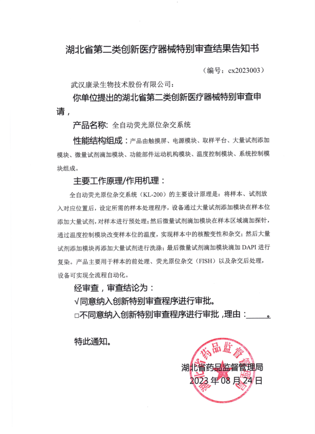 康录生物研发的全国首台FISH全流程自动化的全自动荧光原位杂交系统于2024年7月23日荣获国家二类医疗器械注册证,注册证号:鄂械注准20242225085。