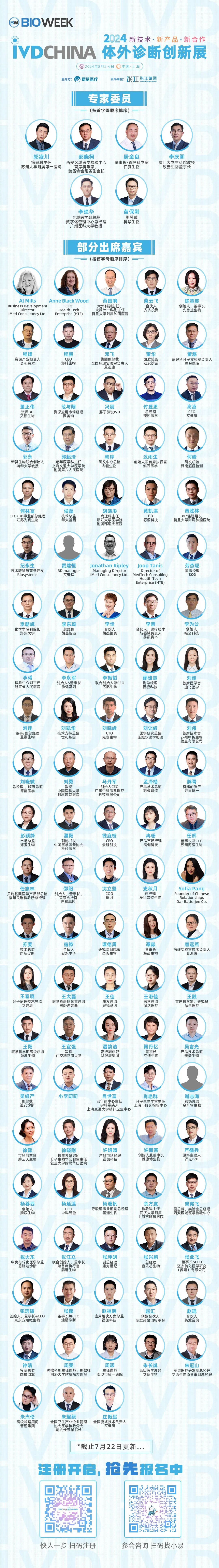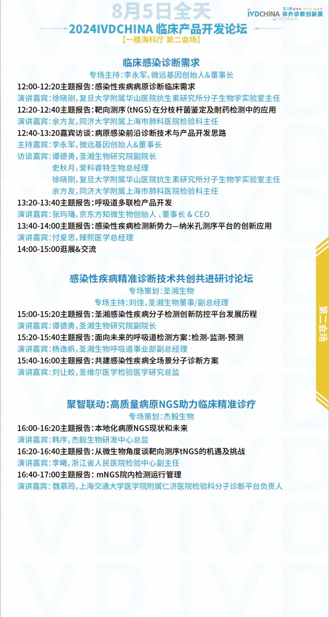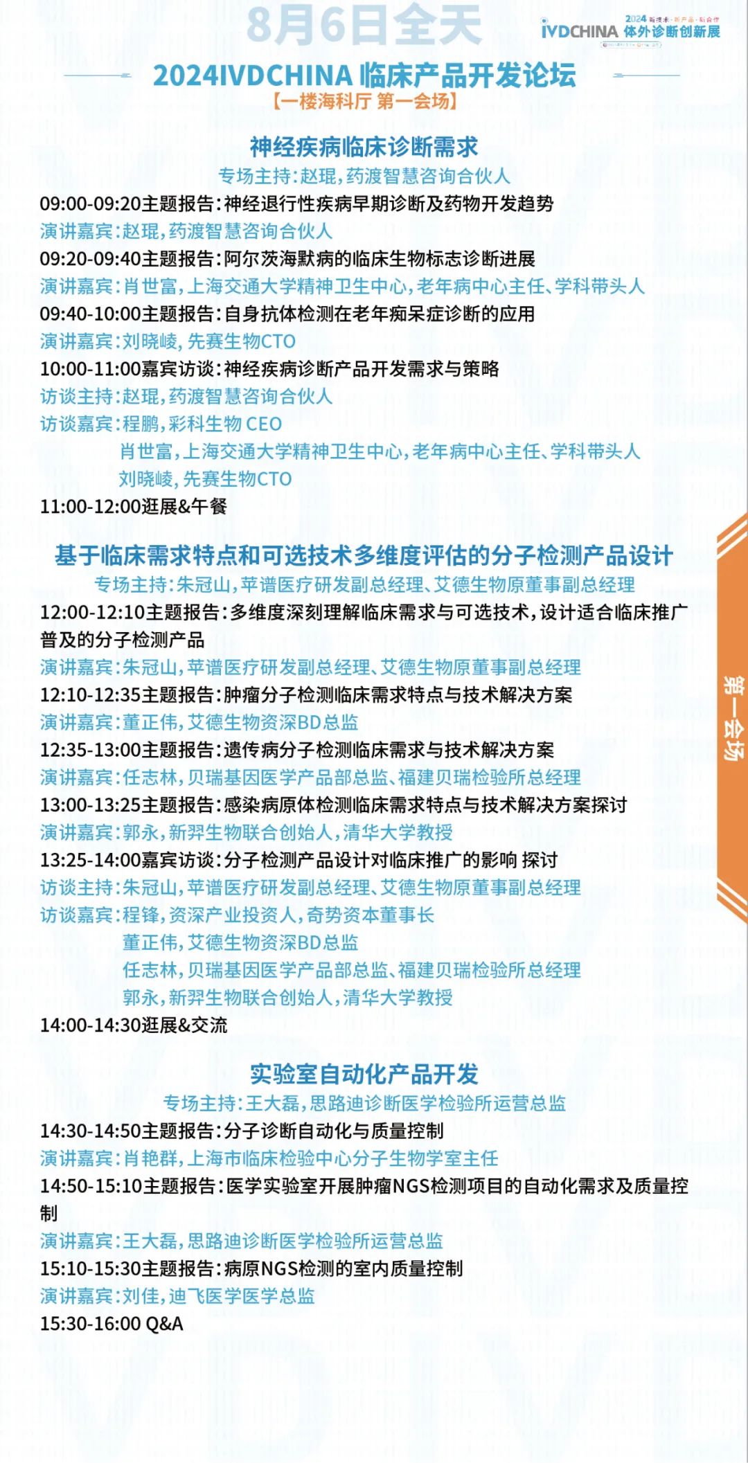 扫码注册大会 参会咨询: @小易诊断13167051807 2024IVDCHINA体外诊断创新展马上就要正式与大家见面啦!展览全程2天(8月5-6日),其中8月5日为开幕日,期待与您现场相见! 签到提醒 01 门票确认 扫描下方二维码,进入个人中心,查看您的签到二维码、门票信息、特邀活动信息。 如您的个人中心页面二维码正常显示且有“未签到”字样,则您的门票注册已生效。 02 签到信息 签到地点:上海张江科学会堂,1楼海科厅前厅 【展商签到】 8月4日 13:00-17:00 【8月5-6日大会与展览】 观众签到: 8月5日 08:00-17:00 8月6日 08:00-15:00 温馨提示:8月5日大会开幕式将于09:00开始 03 资料领取 完成签到后,您可凭代表证领取大会资料(资料有限,先到先得) 04 签到须知 加速入场Tips: 1、 错峰签到:建议您8月4日下午前往上海张江科学会堂一楼海科厅签到,避免8月5日人流拥堵,提前签到更有机会赢取大礼! 2、自助签到:本次大会设有自助签到设备,您可以前往自助签到区操作 05 签到赢好礼 5-6日两天每日早签到,赢取好礼,现场将送出旅行箱、空调毯、玩偶、小易周边等多份好礼,等你来领! 2024IVDCHINA日程 左右滑动查看全日程内容 交通指南 大会地址:上海市张江科学会堂 驾车交通 上海火车站:距离26公里 车程30分钟 上海虹桥火车站:距离40公里 车程40分钟 上海虹桥国际机场:距离37公里 车程40分钟 上海浦东国际机场:距离26公里 车程30分钟 车辆入口: W1号门(可开车驶入地下停车场) 内设地下停车场,收费标准:30分钟免费,超过1小时收费7元,8小时封顶。 地铁交通 地铁13号线学林路3号口,出站后步行600米即可到达 酒店预订 临近会期,我们根据不同价格区间,为大家整理了会场附近的酒店信息,房源紧张,请大家及时预定哦! 下滑浏览完整内容 扫码注册大会 添加@小易诊断 (13167051807) 了解约见及参会服务 部分出席嘉宾 2024IVDCHINA部分参展企业 2024IVDCHINA合作媒体 关于BIOWEEK 由易贸医疗主办,张江集团作为支持单位,联合呈现的BIOWEEK2024将于8月4-10日在上海张江与大家见面,以创新和务实的态度,充分利用上海生物产业资源,和在国际交流中的重要桥梁作用,以技术为出发点,全力打造具有国际影响力的创新技术论坛和展览交流活动。