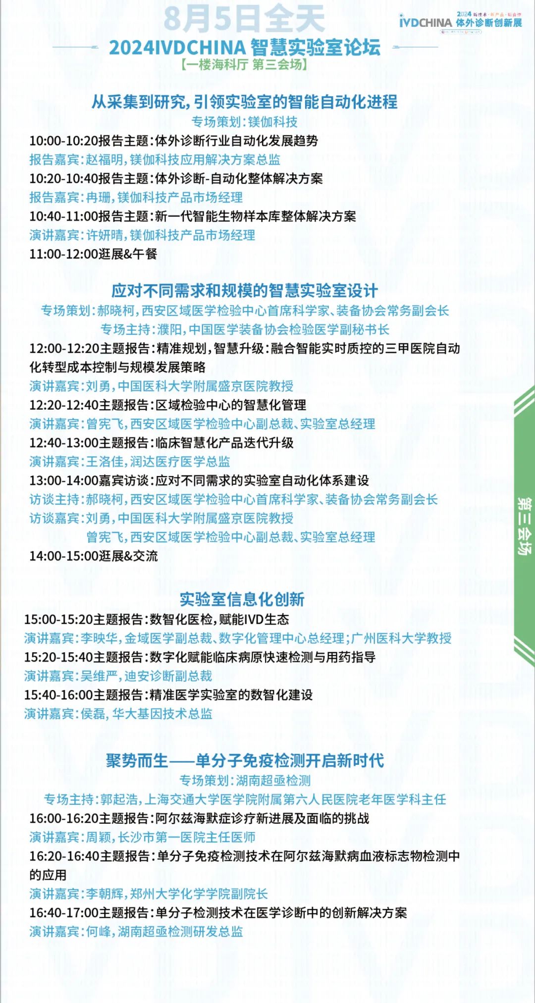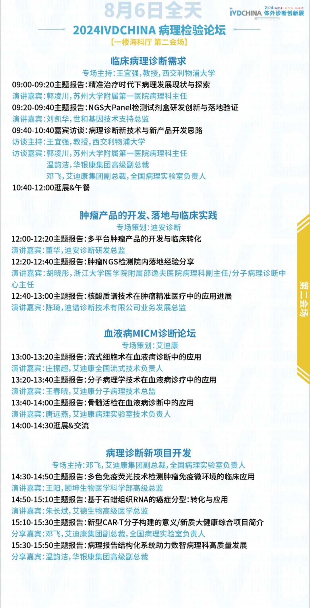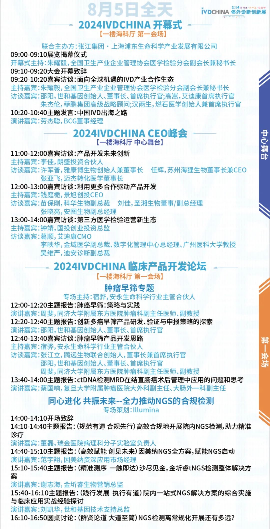 扫码注册大会 参会咨询: @小易诊断13167051807 2024IVDCHINA体外诊断创新展马上就要正式与大家见面啦!展览全程2天(8月5-6日),其中8月5日为开幕日,期待与您现场相见! 签到提醒 01 门票确认 扫描下方二维码,进入个人中心,查看您的签到二维码、门票信息、特邀活动信息。 如您的个人中心页面二维码正常显示且有“未签到”字样,则您的门票注册已生效。 02 签到信息 签到地点:上海张江科学会堂,1楼海科厅前厅 【展商签到】 8月4日 13:00-17:00 【8月5-6日大会与展览】 观众签到: 8月5日 08:00-17:00 8月6日 08:00-15:00 温馨提示:8月5日大会开幕式将于09:00开始 03 资料领取 完成签到后,您可凭代表证领取大会资料(资料有限,先到先得) 04 签到须知 加速入场Tips: 1、 错峰签到:建议您8月4日下午前往上海张江科学会堂一楼海科厅签到,避免8月5日人流拥堵,提前签到更有机会赢取大礼! 2、自助签到:本次大会设有自助签到设备,您可以前往自助签到区操作 05 签到赢好礼 5-6日两天每日早签到,赢取好礼,现场将送出旅行箱、空调毯、玩偶、小易周边等多份好礼,等你来领! 2024IVDCHINA日程 左右滑动查看全日程内容 交通指南 大会地址:上海市张江科学会堂 驾车交通 上海火车站:距离26公里 车程30分钟 上海虹桥火车站:距离40公里 车程40分钟 上海虹桥国际机场:距离37公里 车程40分钟 上海浦东国际机场:距离26公里 车程30分钟 车辆入口: W1号门(可开车驶入地下停车场) 内设地下停车场,收费标准:30分钟免费,超过1小时收费7元,8小时封顶。 地铁交通 地铁13号线学林路3号口,出站后步行600米即可到达 酒店预订 临近会期,我们根据不同价格区间,为大家整理了会场附近的酒店信息,房源紧张,请大家及时预定哦! 下滑浏览完整内容 扫码注册大会 添加@小易诊断 (13167051807) 了解约见及参会服务 部分出席嘉宾 2024IVDCHINA部分参展企业 2024IVDCHINA合作媒体 关于BIOWEEK 由易贸医疗主办,张江集团作为支持单位,联合呈现的BIOWEEK2024将于8月4-10日在上海张江与大家见面,以创新和务实的态度,充分利用上海生物产业资源,和在国际交流中的重要桥梁作用,以技术为出发点,全力打造具有国际影响力的创新技术论坛和展览交流活动。