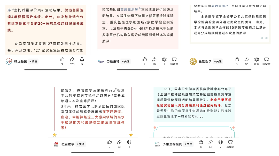 杭州微.......微岩去哪儿了? 没看错的话,这是传统五虎里面唯一的“缺席虎”,扎心了老铁。 五虎缺一虎怎么办? 杰毅,站了出来。 虽然报名要求中明确要求“同一家公司仅允许一家实验室报名” ——但,杭州杰毅从名字上来说关我重庆基拯什么事儿。 别问,问就是在帮微岩补位 ——说好了五虎,那必须有五家实验室整整齐齐。 “五虎的荣光,由我来守护” 02 炸裂的“拉胯” 众所周之,随着mNGS竞争进入白热化,“入院”是兵家必争之地。 45家满分实验室中,有32家属于医院的院内实验室。 ——这32家的技术平台都是跟谁合作的? 结果这一合计,又有人要被“公开处刑”了..... 我搜集了下公开发言的四家官方表述(之前漏了予果的喜报是我的错...): 假设大家都没撒谎 ——微远保底贡献21家满分(20+的起点是21没毛病吧),杰毅保底贡献3家满分(“多家”的起点是3这个没疑问吧),微岩保底贡献1家满分(毕竟它自己没拿到)。 “小学生都知道,32-21-3-1=7” 留给院内实验室的满分名额最多只剩7家。 也就是说,金匙合作的30家医疗机构,至少有23家没有拿到满分。 扣分率76.6%起步...... 放眼整个共建界这也是非常炸裂的存在了。 当然,事物都有两面性,这至少说明金匙很老实——没有在体系内“对答案”。 像下面这两家把“对答案”玩成“抄袭”的,那就不仅仅是水平上的炸裂了。 要么有人在撒谎,要么有人真拉胯。 当然这也给各位PR伙伴上了生动的一课: “没事别瞎发细节,不说话也许真没事” 03 满分的“拦路虎” 回到此次室间质评的结果上,有哪些题是大家最容易做错的?