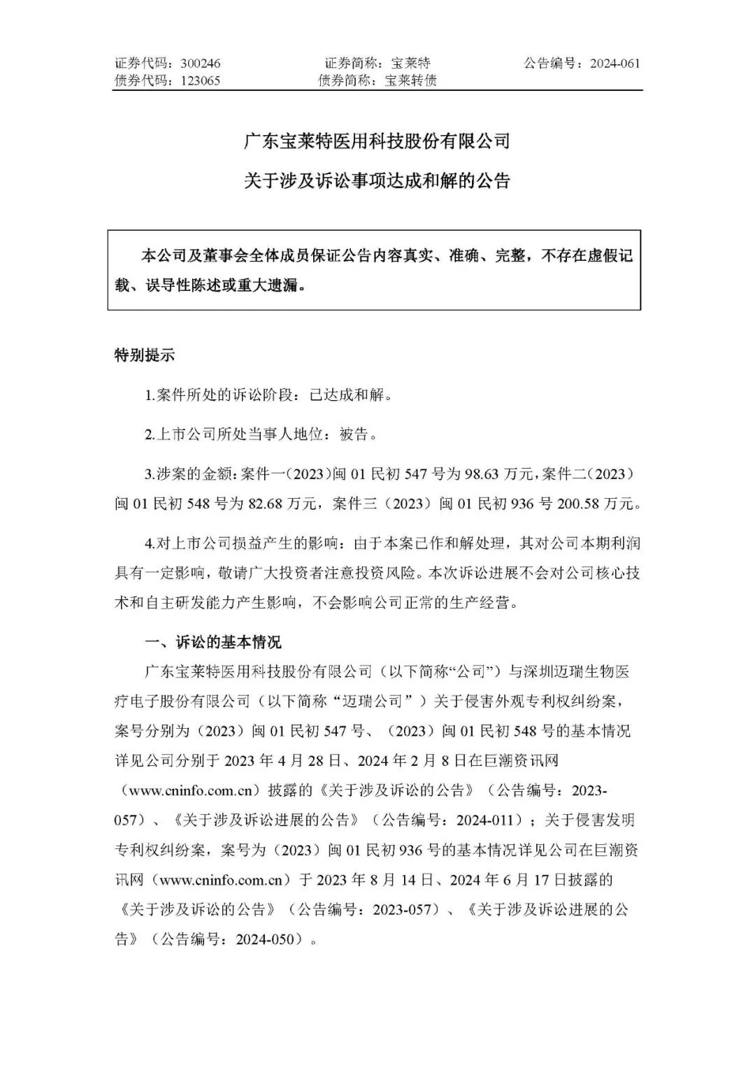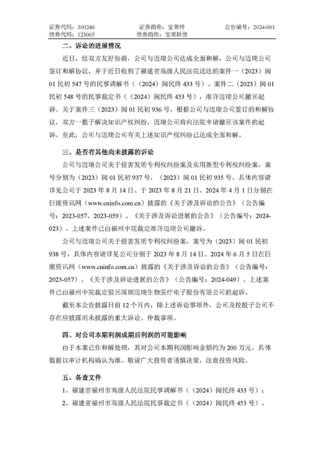 近日,经双方友好协商,公司与迈瑞公司达成全面和解,公司与迈瑞公司签订和解协议,并于近日收到了福建省高级人民法院送达的案件一(2023)闽 01 民初 547 号的民事调解书((2024)闽民终 433 号)、案件二(2023)闽 01 民初 548 号的民事裁定书((2024)闽民终 453 号),准许迈瑞公司撤回起诉。关于案件三(2023)闽 01 民初 936 号,根据公司与迈瑞公司签订的和解协议,双方一揽子解决知识产权纠纷,迈瑞公司将向法院申请撤回该案件的起诉。至此,公司与迈瑞公司有关上述知识产权纠纷已达成全面和解。