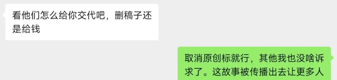 在联系上王辉先生的时候,他在群里和私聊都说了一句话: “洗稿是我们的红线” 我当时就感觉:不妙,轻罪上重罚,这事儿完了。 看似很重视,实则没卵用。 当一件简单的事情被列为红线,会导至一个结果 ——因为承认就会死,代价过大,所以选择抵赖的收益无限大。 “轻罪上重罚”起不到震慑、预防、打击的效果,只会让团伙想尽办法抵赖。 其实我的诉求很“小”,「丁香园」大可不必这么“重视”: