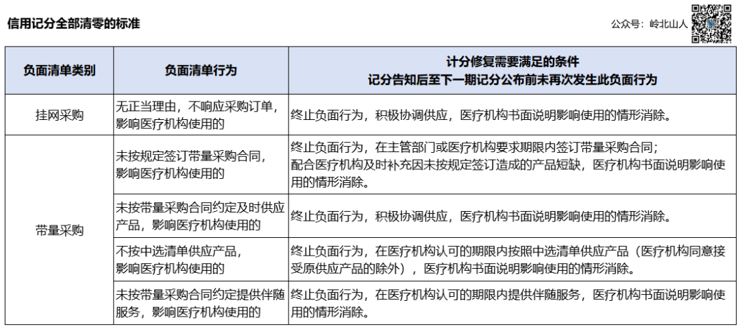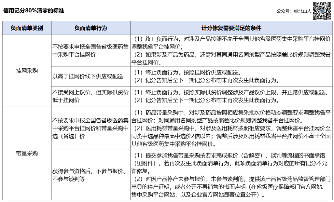 为规范阳光采购信用记分管理,促进医药企业信用记分修复工作公平有序开展,制定本修复标准。1. “无正当理由,不响应采购订单,影响医疗机构使用的”,记分修复需同时满足以下条件:(1)终止负面行为,积极协调供应,医疗机构书面说明影响使用的情形消除。(2)记分告知后至下一期记分公布前未再次发生此负面行为。1. “未按规定签订带量采购合同,影响医疗机构使用的”,记分修复需同时满足以下条件:(1)终止负面行为,在主管部门或医疗机构要求期限内签订带量采购合同;(2)配合医疗机构及时补充因未按规定签订造成的产品短缺,医疗机构书面说明影响使用的情形消除。(3)记分告知后至下一期记分公布前未再次发生此负面行为。2. “未按带量采购合同约定及时供应产品,影响医疗机构使用的”,记分修复需同时满足以下条件:(1)终止负面行为,积极协调供应,医疗机构书面说明影响使用的情形消除。(2)记分告知后至下一期记分公布前未再次发生此负面行为。3. “不按中选清单供应产品,影响医疗机构使用的”,记分修复需同时满足以下条件:(1)终止负面行为,在医疗机构认可的期限内按照中选清单供应产品(医疗机构同意接受原供应产品的除外),医疗机构书面说明影响使用的情形消除。(2)记分告知后至下一期记分公布前未再次发生此负面行为。4. “未按带量采购合同约定提供伴随服务,影响医疗机构使用的”,记分修复需同时满足以下条件:(1)终止负面行为,在医疗机构认可的期限内提供伴随服务,医疗机构书面说明影响使用的情形消除。(2)记分告知后至下一期记分公布前未再次发生此负面行为。 1. “不按要求申报全国各省级医药集中采购平台挂网价”,记分修复需同时满足以下条件:(1)终止负面行为,对涉及产品按照不高于全国其他省级医药集中采购平台挂网价调整我省平台挂网价;(2)如果涉及产品为药品,还需对其同通用名同剂型产品按照差比价规则调整我省平台挂网价。2. “以高于挂网价线下供应或配送”,记分修复需同时满足以下条件:(2)记分告知后至下一期记分公布前未再次发生此负面行为。3. “不接受网上议价,但实际供货价低于挂网价”,记分修复需同时满足以下条件:(1)终止负面行为,按照实际供货价调整涉及产品议价上限,并正常供应或配送。(2)记分告知后至下一期记分公布前未再次发生此负面行为。1. “不按要求申报全国各省级医药集中采购平台挂网价和带量采购中选(备选)价”,记分修复需同时满足以下条件:(1)药品带量采购中,对涉及药品按照《关于规范带量采购药品阳光挂网和支付管理有关事项的通知》(苏医保函〔2022〕254号)及相应集采批次价格动态调整要求调整我省平台挂网价;对同通用名同剂型产品按照差比价规则调整我省平台挂网价。(2)医用耗材带量采购中,对涉及医用耗材按照《关于深入推进医用耗材阳光采购的实施意见》(苏医保发〔2022〕13号)要求,调整我省平台挂网价至同类中选品种最高中选价2倍以内;调整后涉及医用耗材我省平台挂网价不高于全国其他省级医药集中采购平台挂网价。2. “获得参与资格后,不参与报价、不参与谈判等”,记分修复需满足以下条件之一:(1)提交参加我省带量采购按要求完成报价(含解密)、谈判等流程的书面承诺(见附件)。若再次发生此负面清单行为,此项负面清单行为对应的所有记分不允许修复。(2)对因产品停产未参与报价、未参与谈判的,提供该产品省级药品监督管理部门出具的停产证明,或者公开不再销售的书面声明(在省级医疗保障部门官方网站、集中采购平台网站,以及企业官方网站显著位置公开)。 《关于开展药品(医用耗材)阳光采购信用记分管理工作的通知(试行)》规定的医药企业其他负面行为,不允许修复。1. 信用记分公布后,医药企业可通过“江苏省药品和医用耗材招采管理系统”的信用记分管理模块申请修复。2. 修复材料包括信用记分修复报告和修复措施证明材料,需加盖企业公章并以扫描件形式提交。其中,需医疗机构认可的修复措施,医药企业需提交所涉医疗机构的书面说明,并加盖医疗机构公章。