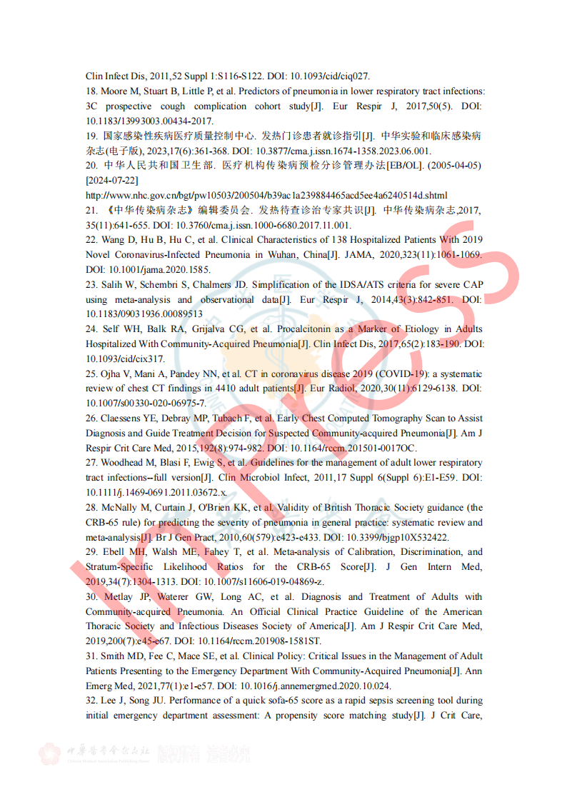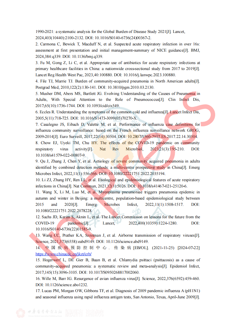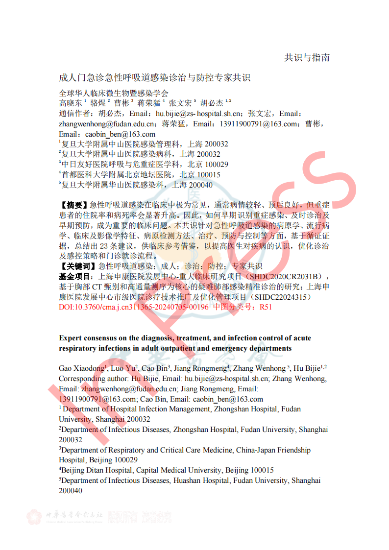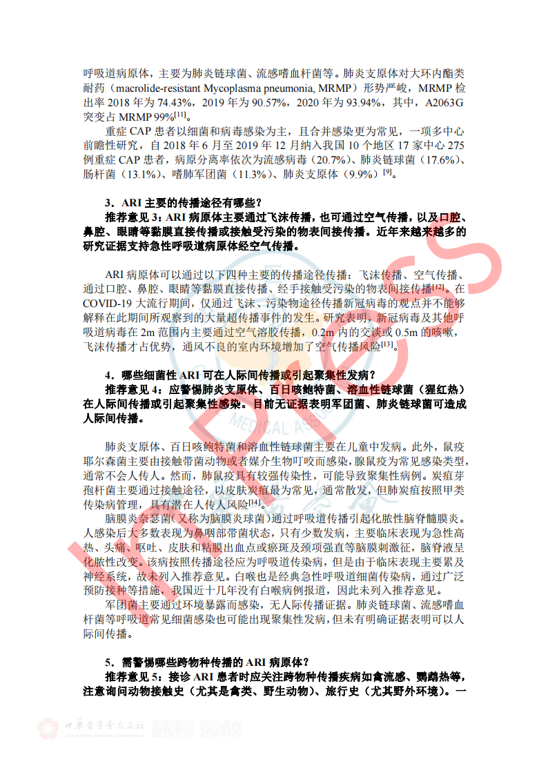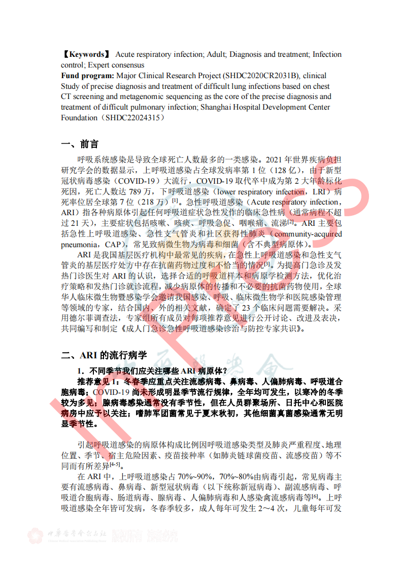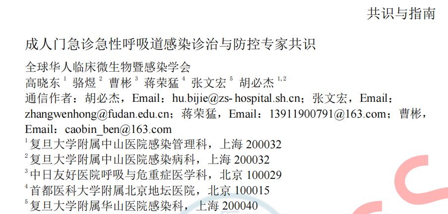 2024年7月26日《成人门急诊急性呼吸道感染诊治与防控专家共识》于中华传染病杂志42卷在线发表,本共识由全球华人临床微生物暨感染学会邀请我国感染、呼吸、临床微生物学和医院感染管理等领域的专家,结合国内、外的相关文献,共同编写和制定,针对急性呼吸道感染的病原学、流行病学、临床及影像学特征、病原检测方法、治疗、预防与控制等方面,基于循证证据,总结出23条建议,供临床参考借鉴,以提高医生对疾病的认识,优化诊治及感控策略和门诊就诊流程。(原文见文末) 急性呼吸道感染(Acute respiratory infection,ARI)指各种病原体引起任何呼吸道症状急性发作的临床急性病(通常病程不超过21天),主要症状包括咳嗽、咳痰、呼吸急促、咽喉痛、流涕 。ARI主要包括急性上呼吸道感染、急性支气管炎和社区获得性肺炎(community-acquired pneumonia,CAP),常见致病微生物为病毒和细菌(含不典型病原体)。 一、ARI的流行病学 1.不同季节我们应关注哪些ARI病原体? 推荐意见1:冬春季应重点关注流感病毒、鼻病毒、人偏肺病毒、呼吸道合胞病毒;COVID-19 尚未形成明显季节流行规律,全年均可发生,以寒冷的冬季较为多见;腺病毒感染通常没有季节性,但在人员群聚场所、日托中心和医院病房中应予以关注;嗜肺军团菌常见于夏末秋初,其他细菌真菌感染通常无明显季节性。 2.近年来我国急性LRI常见病原体有哪些? 推荐意见2:急性下呼吸道感染(lower respiratory infection,LRI)包括急性气管、支气管炎和肺炎;急性气管、支气管炎通常由病毒所致,我国成人CAP最常见的病原体是肺炎链球菌和肺炎支原体,约1/3肺炎支原体感染存在混合感染(病毒或细菌);老年患者中肺炎克雷伯菌、铜绿假单胞菌和金黄色葡萄球菌相对多见;在重症CAP患者中流感病毒、肺炎链球菌、肠杆菌目细菌及嗜肺军团菌多见,且合并感染较多。 4.哪些细菌性ARI可在人际间传播或引起聚集性发病? 推荐意见4:应警惕肺炎支原体、百日咳鲍特菌、溶血性链球菌(猩红热)在人际间传播或引起聚集性感染。目前无证据表明军团菌、肺炎链球菌可造成人际间传播。 5.需警惕哪些跨物种传播的ARI病原体? 推荐意见5:接诊ARI患者时应关注跨物种传播疾病如禽流感、鹦鹉热等,注意询问动物接触史(尤其是禽类、野生动物)、旅行史(尤其野外环境)。一旦发现疑似跨物种传播的ARI,应立即采取检查措施明确病原体并及时上报相关部门。 二、ARI的临床及影像学特征 1.哪些常见临床表现应考虑ARI? 推荐意见6:若出现流涕、鼻塞、打喷嚏和咽痒等较轻的症状,伴或不伴发热,应疑似急性上呼吸道感染。若出现发热、咳嗽、咳痰、呼吸急促到严重的脓毒症和呼吸窘迫等,应疑似急性下呼吸道感染。 表1 ARI常见的临床表现 3.如何通过问诊和常规检验初步评估ARI病原体? 推荐意见8:出现ARI相关症状时,在病毒流行期间、聚集性发病或有相关暴露的情况下,需怀疑病毒感染。而咳黄痰、白细胞、中性粒细胞计数或降钙素原升高时,则应考虑细菌或合并细菌感染。 4.如何识别有重症化倾向的患者? 推荐意见9: ①老年人(≥65岁)、妊娠期妇女、体重过轻或肥胖(BMI<18.5或>30)、长期吸烟者、糖尿病、重要脏器慢性病(如心、肺、肝、肾等)、恶性肿瘤中晚期患者和免疫缺陷人群(长期服用激素或免疫抑制剂、HIV感染、器官移植患者)是ARI重症化的危险人群。 ②氧饱和度(<93%)及常用的早期风险预警评分工具CRB-65 (Confusion, Respiratory rate, Blood pressure, and age≥65)、CURB-65 (Confusion, Urea, Respiratory rate, Blood pressure, and age≥65)可用于门急诊识别非免疫缺陷基础的成人重症ARI高风险患者。 三、ARI病原体检测方法 1.哪些ARI患者需要行病原学检查? 推荐意见11:重症患者、重症高危人群(如老年人、儿童、孕产妇、免疫缺陷人群和有基础疾病人群)感染者、常规治疗无效者、怀疑特殊病原体感染者、有特定病原体流行病学暴露史以及社区或医疗机构内出现的聚集性呼吸道感染患者需进行病原学检查。 2.如何选择病原学检测方法? 推荐意见12:如果在呼吸道病原体流行期间,尤其是病毒感染时,建议尽可能在起病早期采用基于核酸技术的检测方法;如果怀疑合并细菌或真菌感染,应结合传统病原学检测(含涂片染色镜检和分离培养)、血清学检测(抗原/抗体检测)等方法加以鉴别。对于重症感染、可疑特殊病原体感染、免疫缺陷人群或聚集性感染的患者在完善常规检测的同时可选择mNGS/tNGS (Metagenomic Next-Generation Sequencing/Targeted Next-Generation Sequencing)检测。