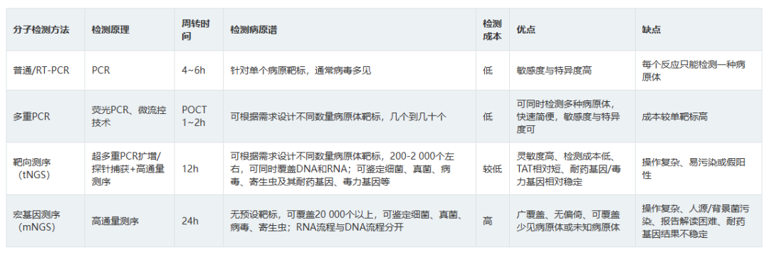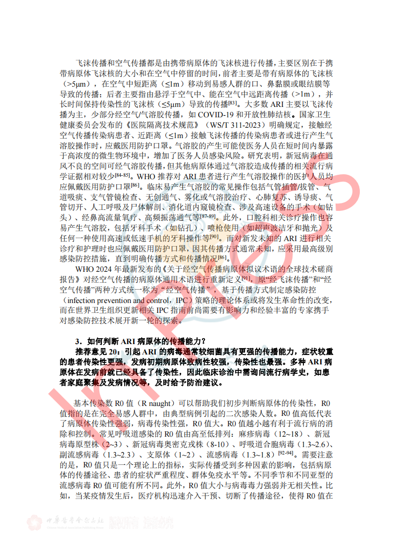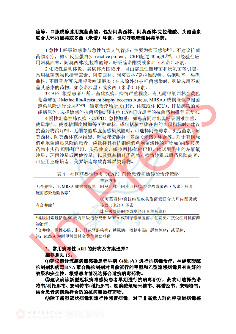 表2呼吸道病原体分子生物学检测方法比较 3.如何选择病原学检测样本类型? 推荐意见13: ①拟诊急性上呼吸道感染时推荐采集鼻咽拭子或口咽拭子; ②拟诊CAP推荐采集深部痰液标本,怀疑细菌性肺炎可同时采集血液标本; ③病情危重或怀疑特殊病原体感染时应同时采集BALF; ④如果患者有胸腔积液应采集胸水标本。 表3 ARI常见病原体检测标本选择和检测项目 四、ARI治疗策略 1.ARI的抗菌药物治疗策略? 推荐意见14: (1)急性上呼吸道感染和急性支气管炎,主要为病毒感染,不建议常规抗菌药物治疗。化脓性扁桃体炎或脓肿,可选用青霉素类、一代或二代头孢菌素。 (2)门诊治疗的 轻中症CAP患者, 根据年龄、基础疾病、有无耐药菌风险等,口服或静脉用抗菌药物,包括 阿莫西林、阿莫西林/克拉维酸、头孢菌素联合大环内酯类或多西(米诺)环素,也可呼吸喹诺酮类单药。 2.常用病毒性ARI的药物及方案选择? 推荐意见15: ①建议确诊流感病毒感染患者早期(48h内)进行抗病毒治疗,神经氨酸酶抑制剂和病毒RNA聚合酶抑制剂对目前流行的甲型和乙型流感病毒具有良好的效果和安全性,根据患者情况选择合适抗病毒药物。 ②建议确诊新型冠状病毒感染患者早期进行抗病毒治疗,药物可选择先诺特韦/利托那韦、奈玛特韦/利托那韦、氢溴酸氘瑞米德韦、莫诺拉韦、来瑞特韦,结合患者病情选择合适的抗病毒治疗药物。 ③除了新型冠状病毒和流行性感冒病毒,对于非高危人群的呼吸道病毒感染,不建议常规予以抗病毒药物;但对于高危人群常见的呼吸道合胞病毒感染,可尝试予以利巴韦林抗病毒药物治疗。 表5呼吸道病毒感染治疗常用药物介绍 五、ARI预防与控制 3.如何判断ARI病原体的传播能力? 推荐意见20:引起ARI的病毒通常较细菌具有更强的传播能力,症状较重的患者传染性更强,发病初期病原体致病性较强,传染性也最强。多种ARI病原体在发病前就已经具备了传染性,因此临床诊治中需询问流行病学史,如患者家庭聚集及发病情况等,及时给予防治建议。 表7 引起ARI常见病原体的潜伏期、传染期和隔离时间 小结 急性呼吸道感染在临床中极为常见,通常病情较轻、预后良好,但重症患者的住院率和病死率会显著升高。因此,早期识别重症感染、及时诊治及早期预防,具有重要临床价值及意义。 需进行病原学检查患者群体