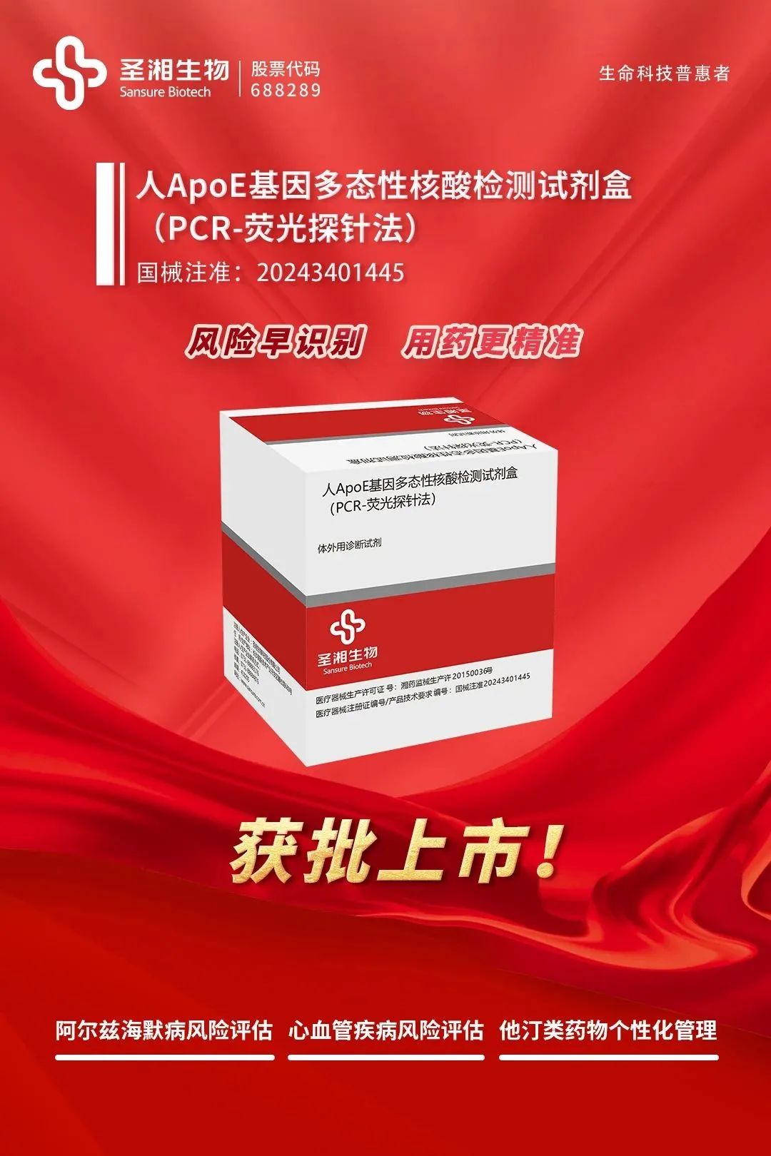 近日,圣湘生物自主研发的药物基因组系列产品——人ApoE基因多态性核酸检测试剂盒(PCR-荧光探针法)通过国家药品监督管理局审核,获批上市。这是圣湘生物继人MTHFR基因多态性核酸检测试剂后,上市的第二款药物基因组系列产品,更是在银发经济领域斩获的第一证。 该试剂采用多重PCR技术,定性检测人外周血样本DNA中ApoE基因388T>C和526C>T多态性位点的基因型,检测限为1ng/μL,同时采用UNG酶+dUTP防污染体系,保障检测结果的准确性。 该产品可辅助临床监测他汀类药物的用药效果,评估阿尔茨海默病及动脉粥样硬化、冠心病、脑梗等心脑血管疾病的发病风险,并为个体化精准诊疗提供依据,应用领域广泛,具有重要的临床意义和市场价值。 关于ApoE基因 ApoE(Apolipoprotein E)基因位于人类19号染色体,由其编码产生的载脂蛋白E,参与血脂的运输、存储和代谢。ApoE基因有2个突变位点,可产生ε2、ε3、ε4这3种单倍体型,它们组合形成了6种基因型,分别是ε2/ε2、ε2/ε3、ε2/ε4、ε3/ε3、ε3/ε4、ε4/ε4,并编码成三种载脂蛋白亚型ApoE2、ApoE3和ApoE4。不同亚型在阿尔茨海默病、动脉粥样硬化等心脑血管疾病的发病风险中存在明显差异,同时影响人体内血脂水平和他汀类药物的用药效果。