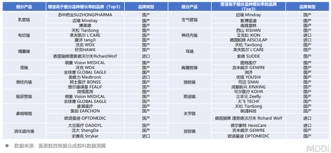 因此,国产替代的进程显著加速,外资品牌仅在支气管镜、膀胱镜、宫腔镜、电切镜等细分领域,实现了品牌规模的正向增长。