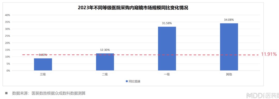 2023年,中国医用内窥镜市场实现了显著增长,同比增长率达到11.91%。在不同等级医院中,增速差异显著。