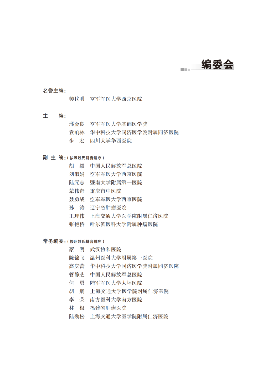 新书简介 《肿瘤分子诊断标志物临床应用》由中国抗癌协会肿瘤标志专委会组织,全国肿瘤内外科、病理科、生物信息学等领域顶尖专家合力编写,共同打造佳作!本书体现前沿观念,汇总临床指南还没有统一诊疗方案的难治性肿瘤,结合分子诊断检测结果,在MDT+MTB指导下诊治成功的疑难案例。该书于2024年8月正式出版发行,填补国内分子诊断标志物临床案例领域的空白,积极推动国内肿瘤整合诊疗水平的提升! 主编介绍 邢金良 空军军医大学基础医学院生理与病理生理学教研室主任,教授,博士生导师。美国MD,Anderson癌症中心(2005-2008)及托马斯杰弗逊大学(2013-2014)访问学者。主要研究方向为肿瘤线粒体生物学及相关肿瘤标志物转化研究。以负责人承担国科金重点、重点国际合作、军队重点项目等课题30余项。总计发表SCI文章160余篇,于J Natl Cancer Inst、Journal of hepatology、EMBO J、Ann Oncol、Clin Chem等杂志上以第一和通讯作者发表SCI文章100余篇(IF>10的18篇)。授权和申报国内及国际发明专利和软件著作权11项。主编或参编专著14部。获国家科技进步二等奖1项(2005-第四),中国抗癌协会科技奖一等奖(2010-03,2020-01)2项,陕西省自然科学一等奖2项(2020-02, 2022-07),第十二届中国专利奖金奖(2010-02)1项。先后获原总后勤部科技新星、陕西青年科技奖、教育部新世纪优秀人才、陕西省中青年科技创新领军人才、陕西省特支计划领军人才等计划资助,2018年荣获中国肿瘤青年科学家奖,2020年被评为新世纪百千万人才工程国家级人选,2023年入选爱思唯尔(Elsevier)中国高被引学者(Highly Cited Chinese Researchers)榜单。现任中国抗癌协会常务理事及中国抗癌协会整合肿瘤学分会主委和肿瘤标志专业委员会名誉主委。 袁响林 华中科技大学同济医学院第二临床学院副院长、华中科技大学同济医学院附属同济医院肿瘤中心主任,二级教授,主任医师,博士生导师。主要研究方向为消化道肿瘤的综合治疗及放射性肺损伤的基础研究,作为负责人先后主持科技部重大项目子课题1项,国家自然科学基金重点项目1项,国家自然科学基金面上项目5项。以第一作者或通讯作者在 Lancet Oncology、JCO、 Annals of Oncology等国际期刊发表论文100 余篇。人卫社八年制教材《肿瘤学》副主编,五年制教材《肿瘤学概论》副主编,人卫社课程思政案例库《肿瘤学概论》主编。荣获“湖北省科技进步一等奖”,中华医学科技奖二等奖。现任中国抗癌协会肿瘤支持治疗专业委员会主任委员,中国抗癌协会放射防护专业委员会候任主任委员,中国抗癌协会肿瘤标志专业委员会副主任委员,中国临床肿瘤学会(CSCO)胃癌、结直肠专业委员会副主任委员。 步宏 四川大学华西医院病理科教授、主任医师、博士生导师、临床病理研究所所长,原四川大学副校长,1993年获华西医科大学博士学位,国家级教学名师,全国模范教师,全国优秀科技工作者,国家卫健委“肿瘤病理规范化诊断标准”牵头人。现任中华医学会病理学分会前任主任委员,国际病理学会中国分会主席,北京精鉴病理学发展基金会理事长,《中华病理学杂志》期刊副总编,《临床与实验病理学杂志》《美国外科病理学杂志中文版》主编,《Histopathology》编委,曾任中国抗癌协会常务理事、肿瘤病理专业委员会主任委员,中国临床肿瘤学会(CSCO)理事、肿瘤病理专家委员会主任委员。从事病理学临床诊断、教学和科研工作四十余年,长于乳腺病理,分子病理及病理人工智能。作为负责人和主研人员获科技部重点项目、国家自然科学基金重大项目和面上项目等多项资助;主编国家级规划教材《病理学(第9版)》《病理学与病理生理学(第1~5版)》《临床病理学(第1~2版)》《组织病理技术》等;以第一作者和通讯作者已发表SCI收录论文100余篇。获国家教学成果特等奖、宝钢优秀教师特等奖和四川省科技进步一等奖及二等奖多项。获全国百篇优秀博士论文指导教师奖,互联网金奖优秀指导教师等。 主编推荐 精准医疗是在基因检测技术快速进步以及生物信息与大数据科学交叉应用背景下发展起来的新型医学概念和医疗模式。其核心是通过基因组、蛋白质组等检测技术,对特定疾病类型进行生物标志物的分析鉴定、验证及应用,从而精确寻找到疾病的原因和治疗的靶点,并可对疾病进行精确分类,最终实现对患者进行个性化精准治疗的目的,提高疾病诊治与预防的效益。 肿瘤作为目前最难攻克的疾病之一,给患者及其家庭、社会带来了重大的经济负担和精神压力,已经成为严重威胁国民健康的公共议题。因此亟须研究出更好的治疗方法及手段,提高广大肿瘤患者的生存质量及生活水平。随着医学科技的不断进步,肿瘤诊疗已经从经验医学、循证医学迈入精准医学时代。肿瘤分子标志物的检测及应用是实现肿瘤精准医疗的重要组成部分,通过对肿瘤分子标志物的精确检测可以为临床提供更多有价值的医学信息,帮助实现个体化医疗。 肿瘤多学科诊疗模式(Multi-disciplinary Team, MDT)已成为肿瘤临床诊疗广泛应用的模式。随着基因检测技术的迅猛发展及肿瘤分子标志物指导下的临床应用使得新型的多学科分子肿瘤专家(Molecular Tumor Board, MTB)会诊模式应运而生。其基于分子标志物的精准检测结合肿瘤患者的具体情况展开深入讨论,尤其对于目前尚无统一诊疗方案的难治性肿瘤,MTB模式的采用将有助于制定