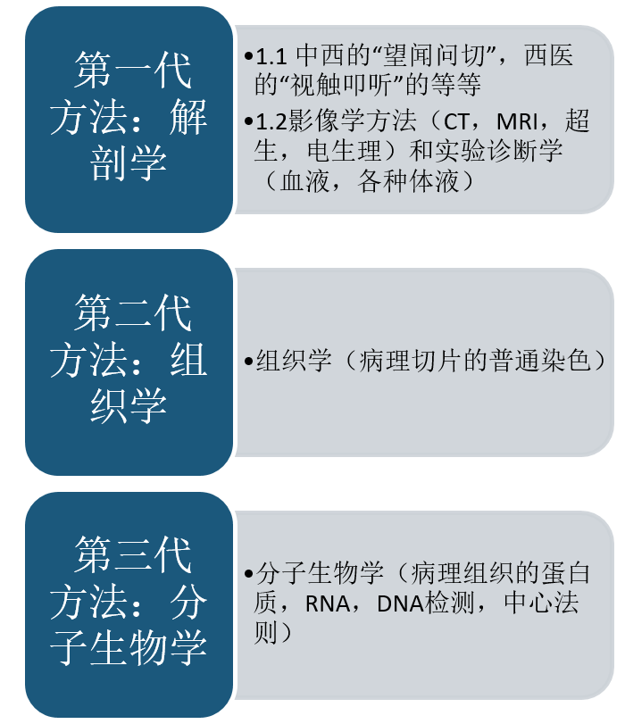 我一般喜欢将一条染色体比做一本书,每一本书是由外包装(染色体上的各种蛋白质)和内容(一个DNA分子)组成,那么人就有46本书,那么一个基因就是书上有意义的段落(编码RNA或多肽),一个核苷酸就是书上的一个字。字(脱氧核糖核苷酸)组成段落(基因),段落(基因)组成书(染色体),46本书(46条染色体)组成生命之书。 细胞要做一件事不是就去翻一次书,而是照着书上的关键段落(DAN)誊写了一个小抄(RNA),再拿着小抄去办事(合成蛋白质)。小抄用的字(核糖核苷酸)和书(DAN)上用的字(脱氧核糖核苷酸)不一样。 然后计划写关于基因检测的科普,但是标题写成“如何阅读人体这本书”,就不免想起来以前上诊断学的时候学到的一些东西。如下~以前看过一篇文献还是那本书里面说到(实在是不记得是那篇了,有谁见过帮着找找,我也继续找找),某个病发生了,蛋白层面(分子生物学层面)改变检测到是多久,再过多久病理学层面(组织学层面)的改变可以检测到,最后又过多久影像学(解剖学层面)改变可以检测到,最后过多久才出现症状。但是医学发展的过程是,先能检测疾病发生的最后阶段,后才能检测疾病发生的中间阶段,而今天,我们可能已经进入了能够检测疾病发生的早期阶段了(疾病的信息还在中心法则里流动)。第一代方法:解剖学(将人体整体或器官作为一个整体的思想)检查方法包括:1.1 中西的“望闻问切”,西医的“视触叩听”的等等(边际成本接近于0,或者说性价比高的方法,个人认为这是很多基层医生和患者特别推崇这些检查方法的原因,但是这里的高性价比的真相是高性价比=低的检测性能/特别低的价格 1.2 影像学方法(CT,MRI,超生,电生理)和实验诊断学(血液,各种体液)第二代方法:组织学(病理切片的普通染色)第三代方法:分子生物学(病理组织的蛋白质,RNA,DNA检测,中心法则) 总结:熟读王叔和,不如阅知因,这是生物医学发展的趋势(这里的“因”是指疾病发生早期,疾病信息流在中心法则里流动的过程,也就是疾病发生的原因。)