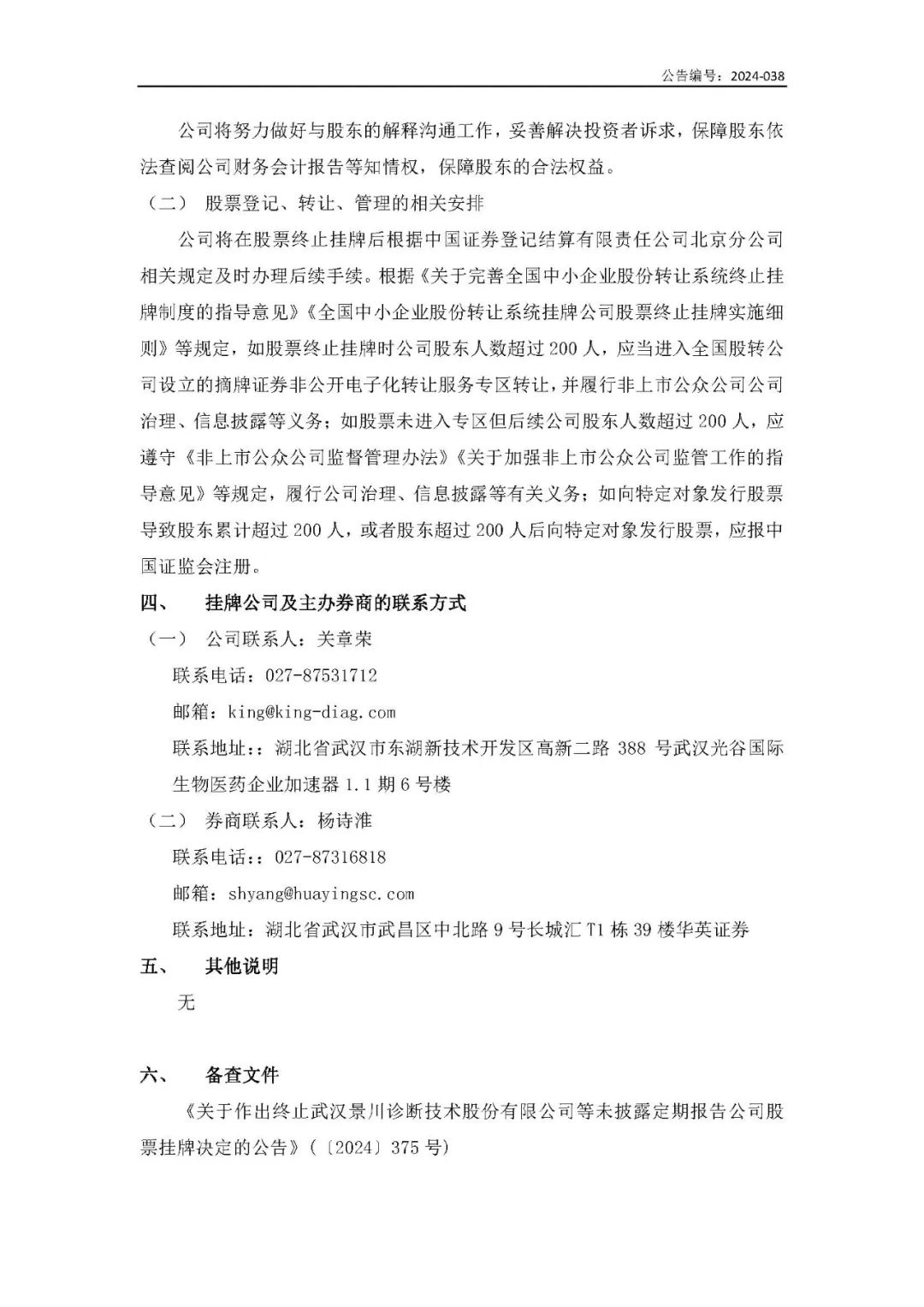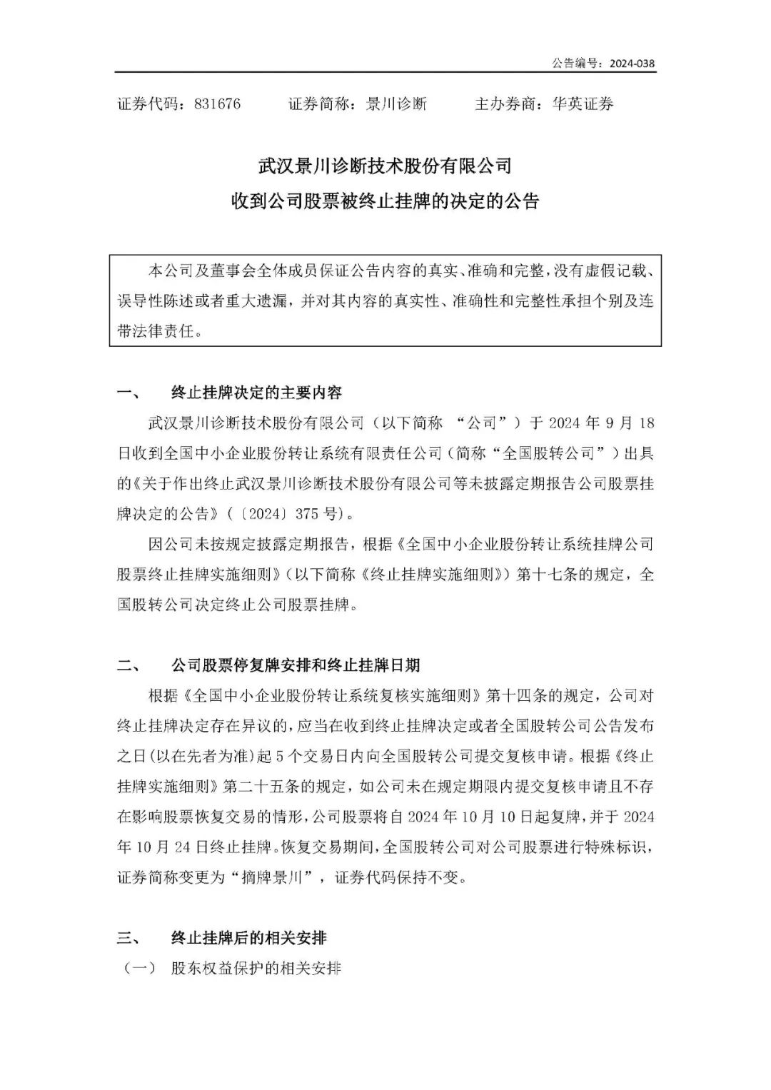 武汉景川诊断于2024年9月18日收到全国股转公司出具的《关于作出终止武汉景川诊断技术股份有限公司等未披露定期报告公司股票挂牌决定的公告》(〔2024〕375 号)。因公司未按规定披露定期报告,根据《全国中小企业股份转让系统挂牌公司