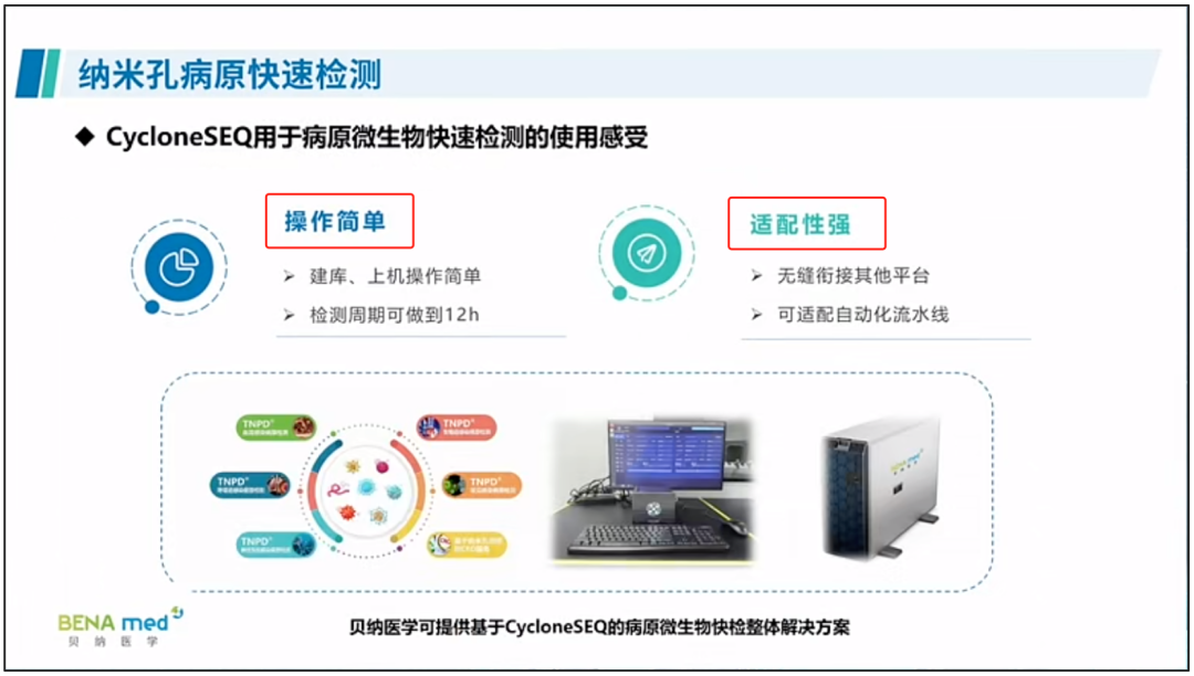 WY01是一台高通量纳米孔测序仪。在WT02的基础上,设备体积不加大,但测序芯片密度提高了2.52倍,单芯片孔蛋白数提高了8倍,达到惊人的3万个蛋白孔。单芯片通道规模提升8倍意味着单芯片数据产出也将提升8倍。同时,单次准确率提升至99%。 下午的CycloneSEQ应用分享会,来自华大、科研院校、企业客户,分别展示了基于CycloneSEQ-WT02的长时段、广范围的测试分享。领域涉及多物种基因组组装、环境微生物、农业育种、遗传病诊断、病原快速检测、肿瘤变异检测、极端环境原位测序等各个方面。 值得注意的是,这些用户均在纳米孔测序方面已有数年研发和产品转化经验。这对我们了解CycloneSEQ-WT02的真实水平,有较大参考意义。(贝纳医学,CycloneSEQ用于病原快速检测)(迪安诊断,CycloneSEQ在临检产品的表现)(华大研究院,CycloneSEQ用于物种基因组组装)02 客观来讲,CycloneSEQ-WT02在刚发布时就有如此表现,实属不易。从产品质感、性能表现、内部测试、用户测评、配套产品等多方面的集中展示可以看出,这确实是一次准备充分、积淀已久的产品发布,而非只停留在PPT阶段。而且,首批达成CycloneSEQ签约合作意向的科研及临床用户代表,就达到了70家。在整体表现不逊色进口品牌的基本前提下,基于用户视角,大家选择华大CycloneSEQ的理由,会是什么?价格&成本,这也是所有与会的研究者、应用企业都在会议中明确提到的问题:- 研究者希望价格的下降,实现测序自由,让有限的经费生产更多的数据;