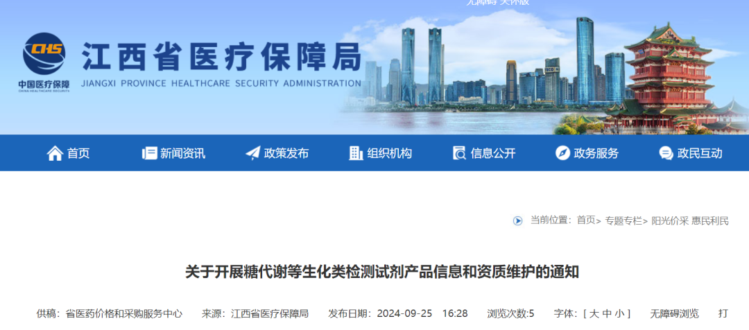 9月25日,江西省医保局发布消息,关于开展糖代谢等生化类检测试剂产品信息和资质维护的通知。  为有序推进糖代谢等生化类检测试剂省际联盟集中带量采购,现开展产品信息和资质维护。有关事项通知如下:(一)进一步填报属于本次集采范围内的产品信息、删除不在本次集采范围内的产品信息;(二)企业需维护相关品种的竞价分组单位、室间质评通过情况、是否属于浓缩型试剂及稀释后容量等信息,并按系统要求上传相关材料。(一)新增“离子微量元素-总铁结合力(TIBC)”为集采品种。企业可登录招采管理子系统,就新增品种填报产品信息,同时可对前期已经申报的产品进行增删。(二)包装计量单位为“人份+容量”的规格产品,企业需选择确认“人份”或“容量”作为竞价分组的包装计量单位。(三)具体操作方法参考系统首页“帮助文档”下相关操作手册。