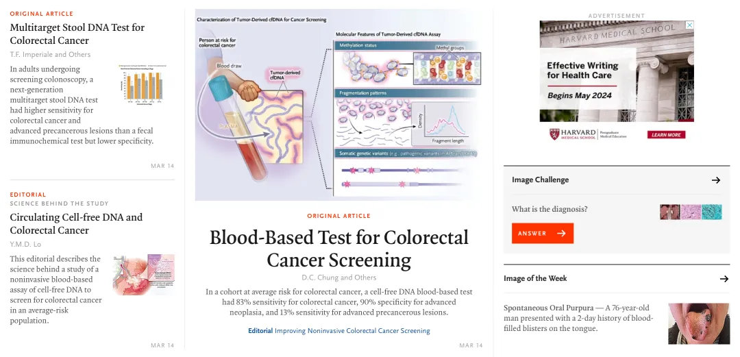 “十年磨一剑”的升级,推开的是下一个十年的星辰大海 故事的起点是3月14日。 当天,NEJM首次同时发表了两项重磅的肠癌早筛研究。 ECLIPSE和BLUE-C 四个月后的7月29日,ECLIPSE率先开花结果 ——Guardant Health的血检肠癌筛查产品Shiled获FDA批准 又过了两个月的10月4日,BLUE-C也终于修成正果 ——Exact Sciences宣布Cologuard Plus获得FDA批准,用于45岁以上平均风险人群的肠癌筛查。 这一天,距离Cologuard首次获批已经过去了十年。