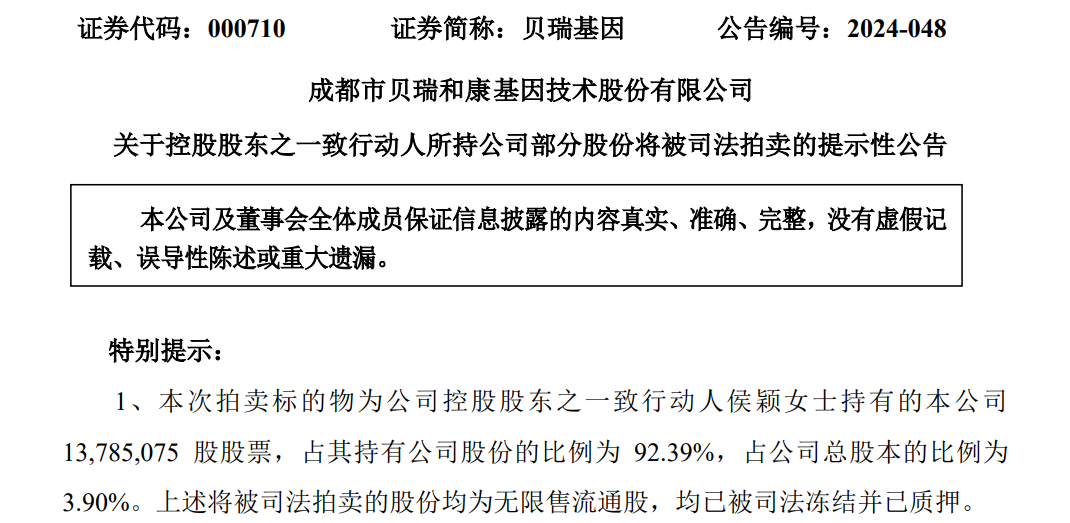 贝瑞基因创始人来自有着中国基因行业“黄埔军校”之称的华大基因,是“华创”中的代表企业之一。2010年5月,高扬、周代星、侯颖联合创立贝瑞基因,专注于NIPT的研发和临床应用。 无创产前基因检测(NIPT)作为降低出生缺陷的最有效手段,在基因检测市场中占据了主导地位。在这一领域,华大基因与贝瑞基因形成了两大寡头格局,而其他参与者如达安基因、诺和致源、安诺优达等也各具特色。 贝瑞基因通过直接向医疗机构提供测序仪和试剂的方式,迅速实现了业务的规模化,而华大则坚守实验室服务模式,二者在NIPT产品上长期保持着此消彼长的竞争态势。 拍卖 10月9日晚间,贝瑞基因发布重要公告,指出公司控股股东之一致行动人侯颖女士持有的部分股份将被司法拍卖。 此次拍卖涉及侯颖女士所持有的公司股份共计1378.5075万股,占其所持股份比例的92.39%,占公司总股本的3.90%。 据公告内容,贝瑞基因近日收到侯颖女士发来的《成渝金融法院网络司法拍卖事项通知书》,并通过司法拍卖网络平台确认,侯颖女士的这部分股份将于2024年10月31日上午10点至2024年11月1日上午10点(延时除外),在淘宝网司法拍卖网络平台上进行为期24小时的公开拍卖。拍卖标的为侯颖女士持有的公司13785075股股票,起拍价将基于2024年10月30日前二十个交易日的收盘价均价,并下浮10%计算。 此次司法拍卖源于侯颖女士与国信证券股份有限公司之间的股票质押式回购合同纠纷。因此,成渝金融法院决定对侯颖女士已被司法冻结的这部分股份进行拍卖。 截至公告日,侯颖持有公司股份1492.0736万股,占公司总股本的比例为4.22%,其股份累计被司法拍卖528.4925万股。 回望 回顾贝瑞基因的创立历程,高扬、周代星、侯颖三位创始人于2010年在北京三元桥曙光大厦共同创办了这家公司,专注于NIPT的研发和临床应用。他们各自拥有丰富的行业背景和经验,为公司的发展奠定了坚实的基础。 在过去的几年中,贝瑞基因曾经历过辉煌的时刻。特别是在2020年,由于新冠检测业务的蓬勃发展,公司股价一度飙升至98元的高位。然而,正如所有事物都有兴衰起伏,贝瑞基因的股价在达到顶峰后也开始了回调之旅。 截至9日收盘,贝瑞基因报8.48元/股,跌9.79%,总市值29.98亿元。甚至不及当年顶峰时期的一个零头。 值得注意的是,据不完全统计,自2021年6月底以来,公司控股股高扬及其一致行动人侯颖就已经累计减持830万股,合计套现金额约13250万元。 资料显示,贝瑞基因主营业务为以高通量测序技术为基础的基因检测服务和基因检测相关的设备、试剂销售,公司致力于基因测序技术向临床应用的全面转化,聚焦生育健康、遗传病检测、肿瘤检测、科技服务等领域,通过“产品+服务”的综合方案为各级医院、第三方医学实验室、科研院所等医疗及科研机构提供医学产品及服务。 据贝瑞基因发布的2024年半年度报告显示,公司实现营业收入5.52亿元,同比减少1.59%,归属于上市公司股东的净利润926万元,实现扭亏为盈;公司毛利率同比提高8.8个百分点。在此之前,贝瑞基因已连续三年净利亏损。 作为最早将NIPT引入国内市场的企业之一,尽管在资本化道路遇到了一些曲折,但事实上已经走出测序平台国产化的自主道路,可能未达到市场预期那么高,但也在基因测序服务起到代表示范作用,期待贝瑞基因未来更好的发展。 |