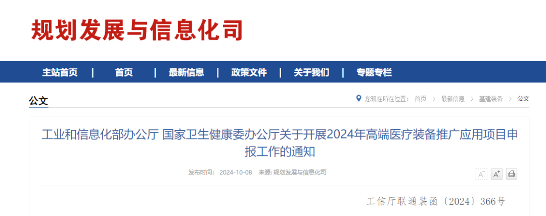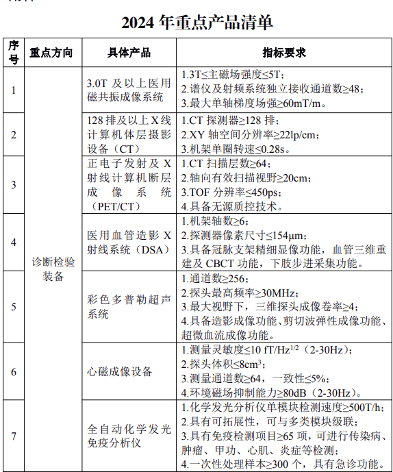 近日,业和信息化部办公厅 国家卫生健康委办公厅发布《关于开展2024年高端医疗装备推广应用项目申报工作的通知》,其中体外诊断设备全自动化学发光免疫分析仪列为该项目重点方向,并提出了明确指标要求,具体内容如下: 各省、自治区、直辖市及计划单列市、新疆生产建设兵团工业和信息化、卫生健康主管部门: 为深入贯彻健康中国、制造强国战略部署,按照《“十四五”医疗装备产业发展规划》部署要求,加快推进高端医疗装备创新发展和推广应用,现就开展2024年度高端医疗装备推广应用项目申报工作有关事项通知如下: 一、推广应用项目重点方向 面向典型应用场景,遴选一批高端医疗装备技术创新与临床应用水平处于全国前列,对高端医疗装备医工协同创新、中试验证、临床研究、迭代升级与推广应用等具有较强引领带动作用的项目。本年度重点开展诊断检验、治疗、监护与生命支持、养老康复、人工智能辅助诊疗5个方向的高端医疗装备推广应用,具体产品见附件1。 二、申报条件 (一)申报主体要求。原则上申报主体为牵头医疗装备生产企业、牵头医疗机构和参与医疗机构等组成的医工联合体,联合体内单位数量原则上不超过10个。 (二)申报单位要求。医工联合体内所有单位须为在中华人民共和国境内注册,具有独立法人资格的企事业单位,近三年未发生重大安全、环保、质量等事故或医疗事故,没有司法、行政机关认定的违法失信行为或涉嫌违法正在接受审查等情况。牵头单位拥有较强的行业引领地位。每个单位最多牵头或参与申报3个不同产品的推广应用项目。同一单位在同一产品申报中参加2个及以上联合体的相关申报均视为无效。 (三)申报产品要求。对所申报推广应用的高端医疗装备产品,牵头医疗装备生产企业须已取得中华人民共和国医疗器械注册证。 (四)申报材料要求。申报材料及所附资质等应真实、合法,不得涉及国家秘密、商业秘密等内容。 三、推广应用要求 (一)产品使用要求。在推广应用过程中,高端医疗装备的使用应符合《医疗器械监督管理条例》《医疗器械生产监督管理办法》和《医疗器械临床使用管理办法》等有关要求。 (二)组织保障要求。医工联合体应建立较为完善的医疗装备研制生产、临床研究管理和资金保障体系,医疗机构重点保障高端医疗装备临床应用研究及推广的技术和环境条件;医疗装备生产企业重点保障高端医疗装备运行安全及改进提升的技术和软硬件条件。 四、工作程序 (一)组织申报。各地工业和信息化、卫生健康主管部门组织符合条件的医疗装备生产企业、医疗机构,按照自愿原则组成医工联合体,编写申报材料(见附件2)。牵头单位对医工联合体内的参与单位资质和相关材料负责。 (二)初审推荐。各地工业和信息化、卫生健康主管部门分别对牵头医疗装备生产企业、牵头医疗机构的资质和项目申报材料进行审查,并于2024年10月30日前将书面推荐函(附推荐汇总表,见附件3)、申报材料(纸质版、电子版各1份)分别报工业和信息化部(装备工业一司)、国家卫生健康委(规划发展与信息化司)。 (三)遴选认定。工业和信息化部、国家卫生健康委组织专家或第三方机构对推广应用项目申报材料进行评审,遴选并公布符合要求的推广应用项目名单。推广应用项目实施周期一般不超过3年。 五、联系人及电话 工业和信息化部装备工业一司 余敬秋 010-68205603 国家卫生健康委规划发展与信息化司 刘乐欣 010-68791230
