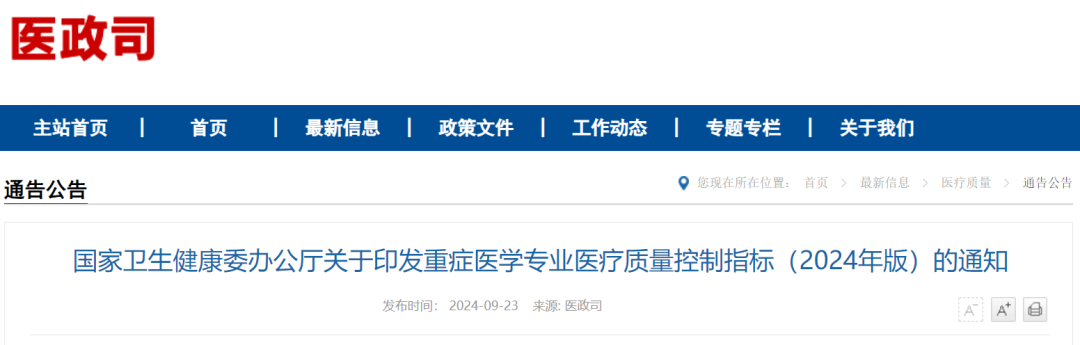 最近看到国家卫健委发布《重症医学专业医疗质量控制指标(2024年版)的通知》,同时废止了《重症医学专业医疗质量控制指标(2015年版)》。