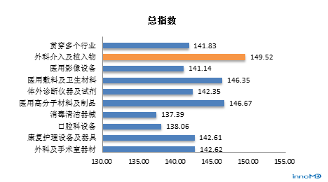 数据来源:中国医疗器械行业协会、医疗器械创新网 所处不同子行业受访者对中国医疗器械行业总信心指数均较高,其中以外科介入及植入物行业的受访者总信心指数最高 数据显示,所处不同子行业受访者对中国医疗器械总信心指数均较高,而外科介入及植入物行业的受访者总信心指数最高,是149.52。其次为医用高分子材料及制品行业的受访者为146.67;第三为医用敷料及卫生材料行业的受访者,为146.35.